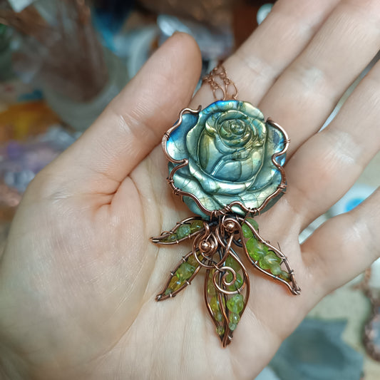 Labradorite rose with chrysolite leaves. Pendant