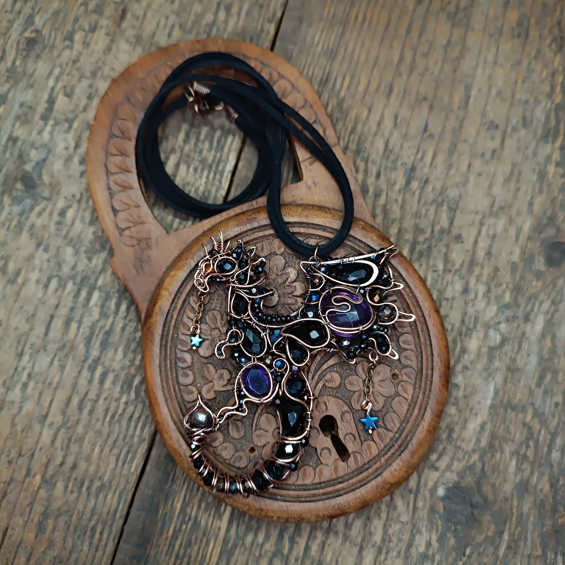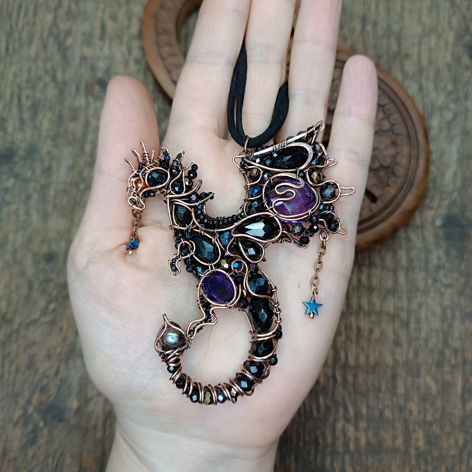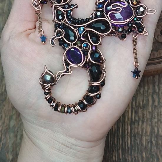 My dragon is made of copper, faceted amethysts, onyx, agate, spinel, black pearl, hematite stars, glass beads, seed beads.
