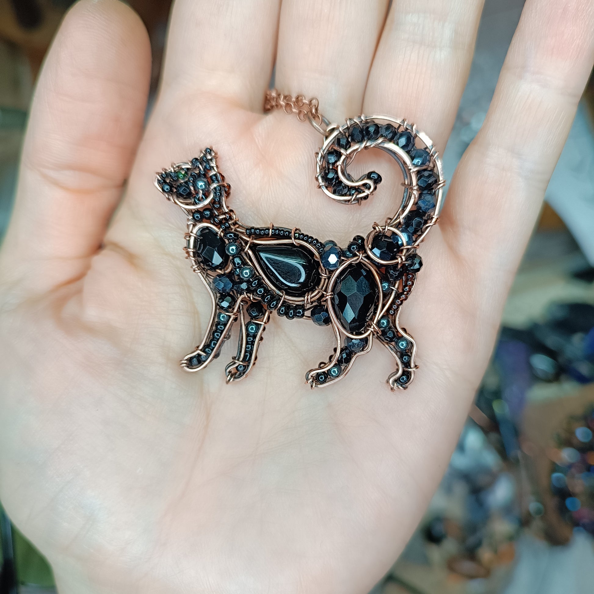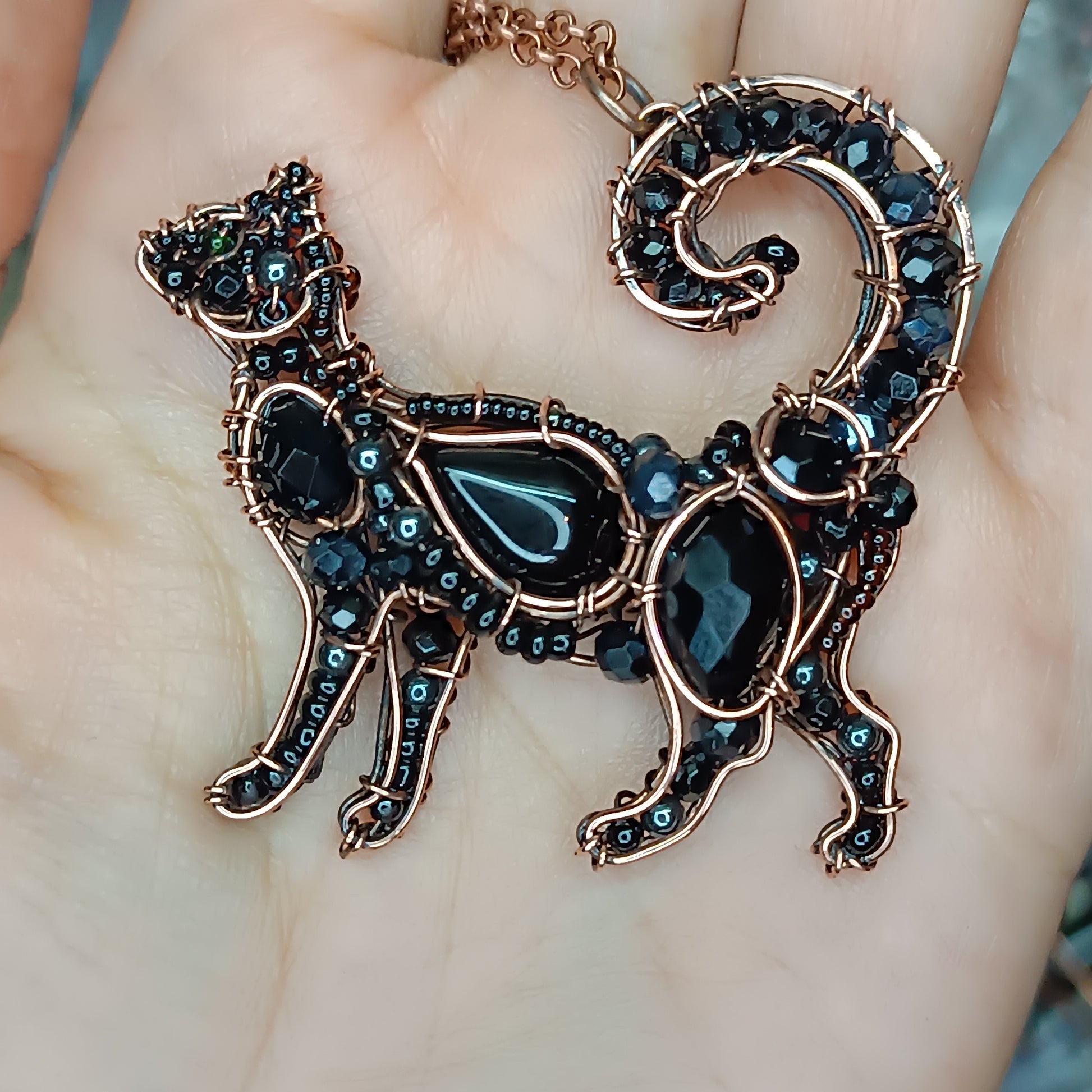 Little (1.75") cat pendant made of cooper, onyx, hematites and glass