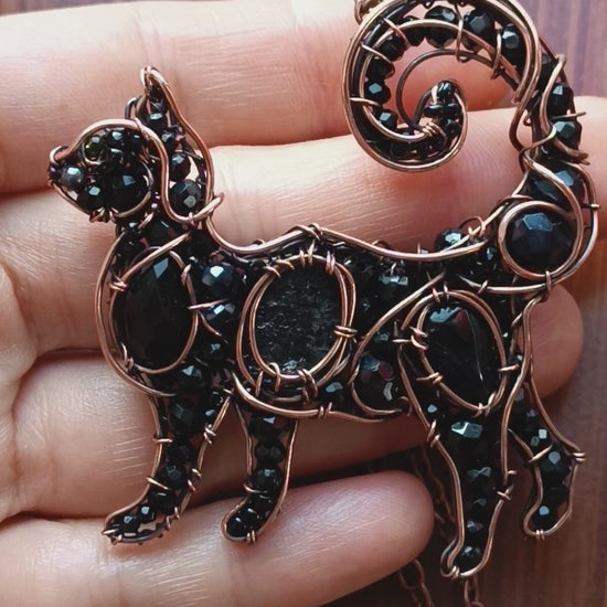 Wire wrapped copper cat pendant with black tourmaline, obsidian, hematite, zircon, spinel and glass beads.