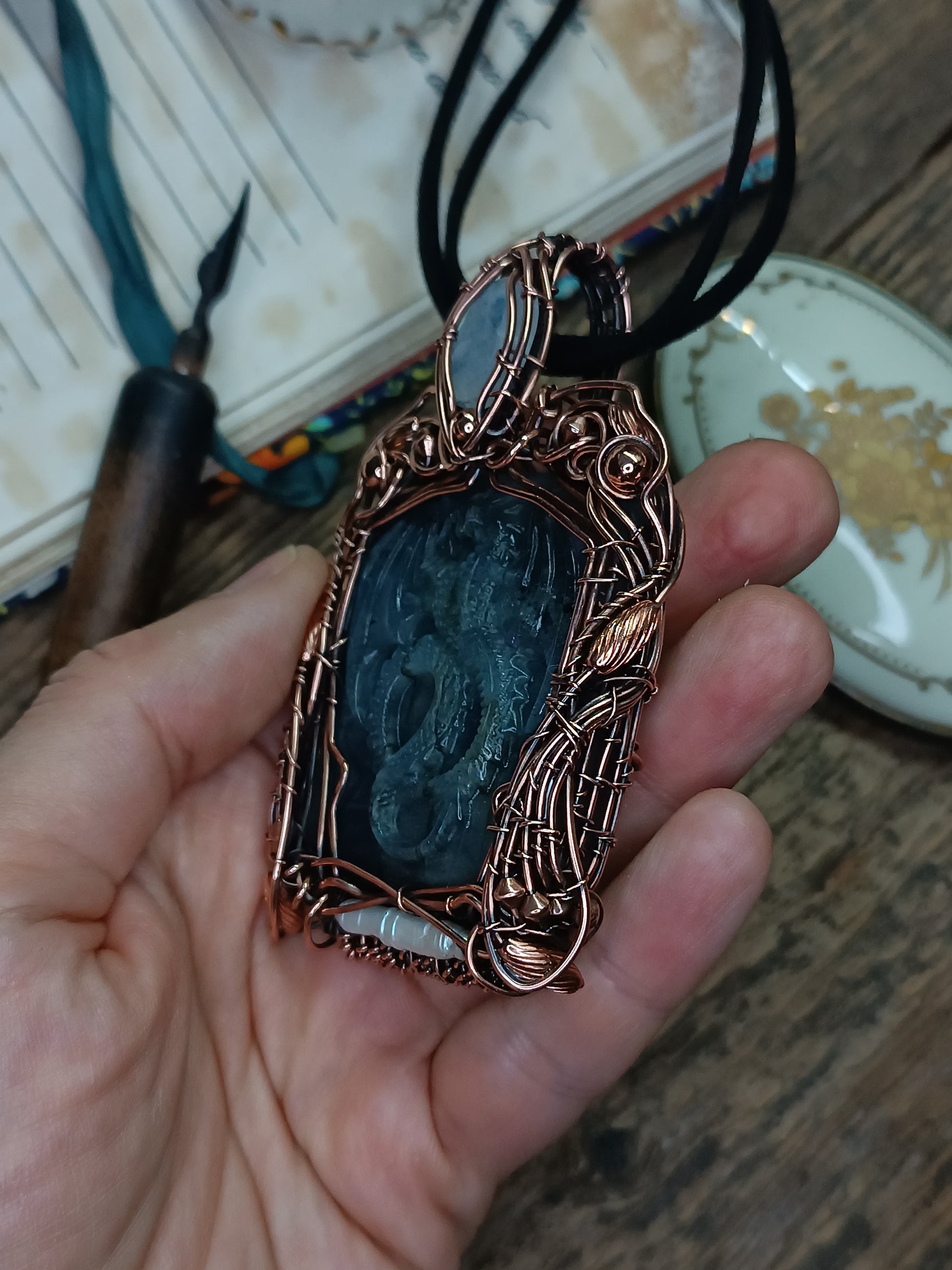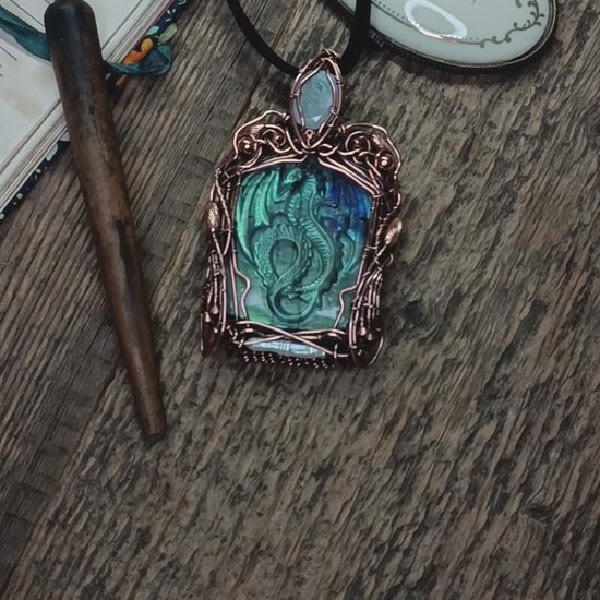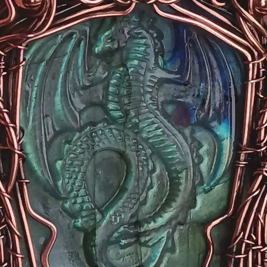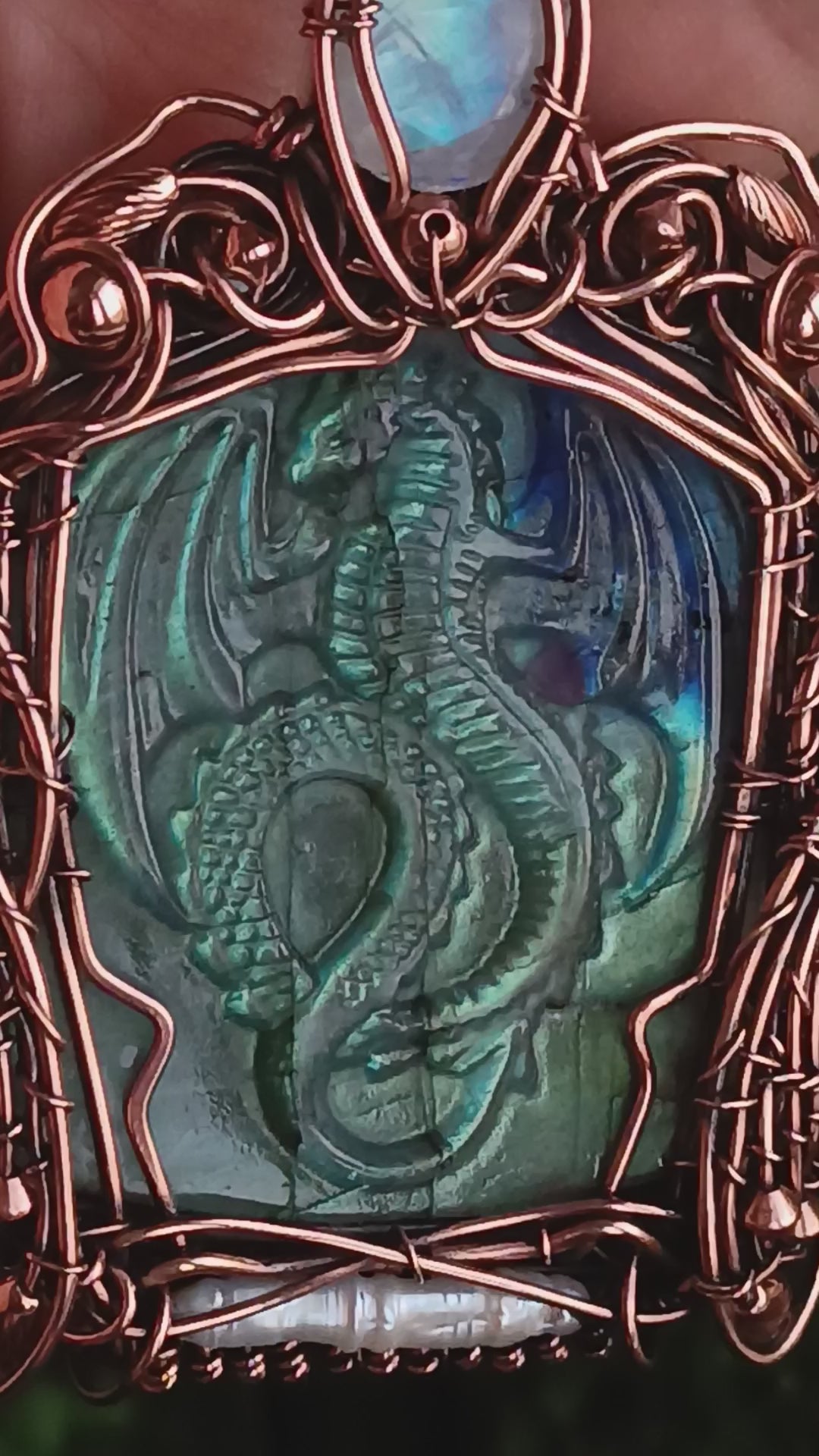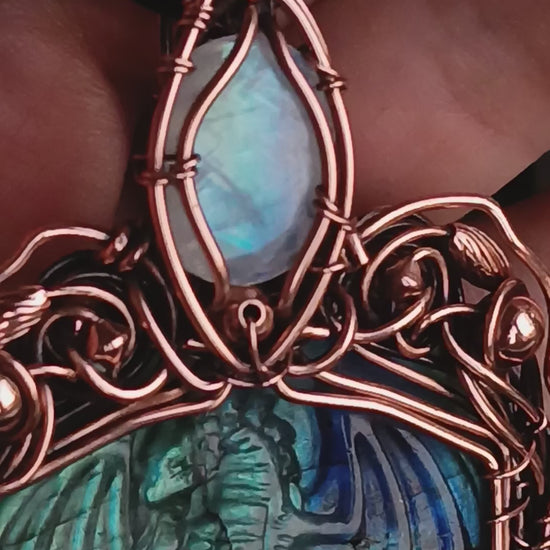 Blue dragon carved in labradorite and adorned with copper wire wrap, a faceted moonstone and a pearl.