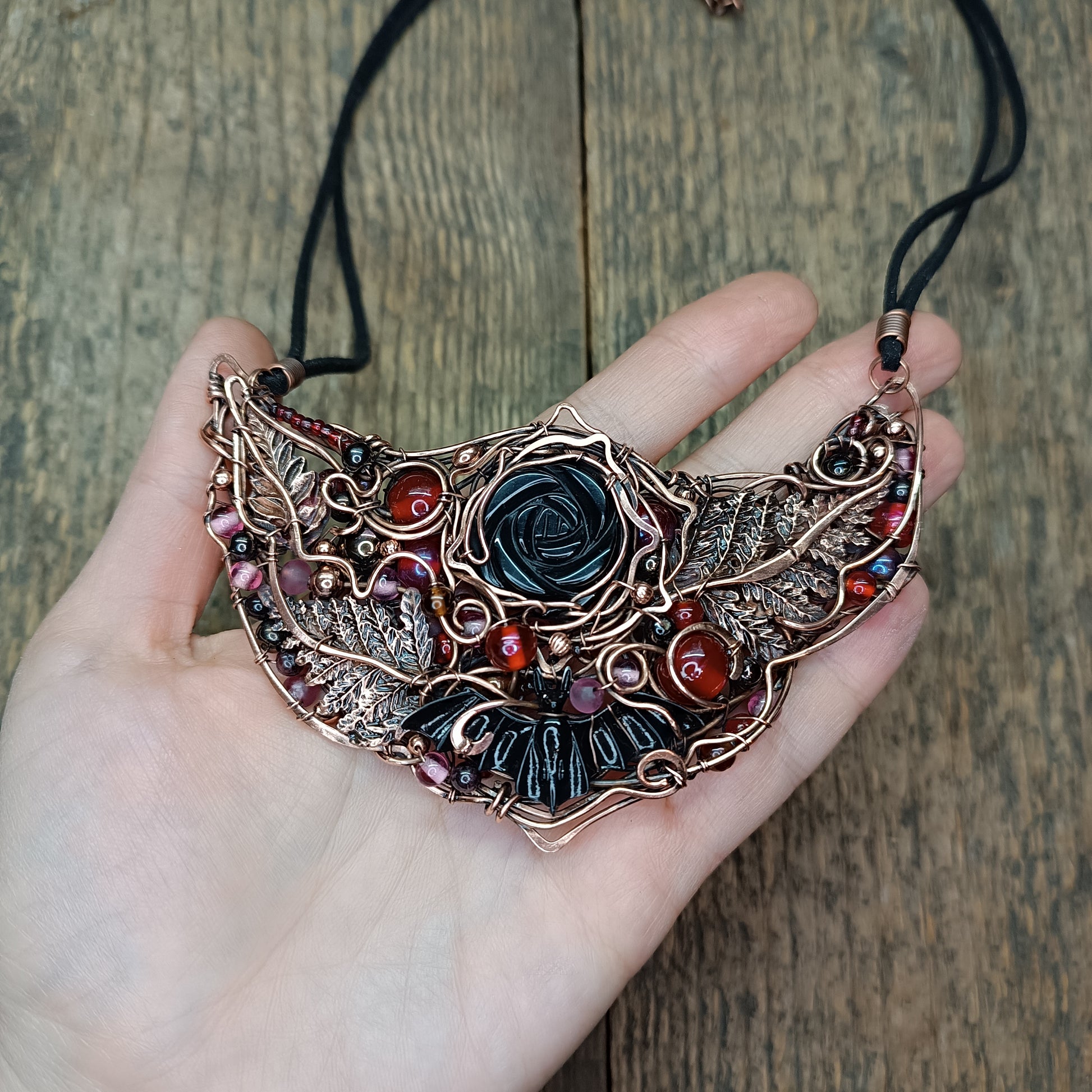 Gorgeous statement necklace with onyx rose, garnet and glass beads.