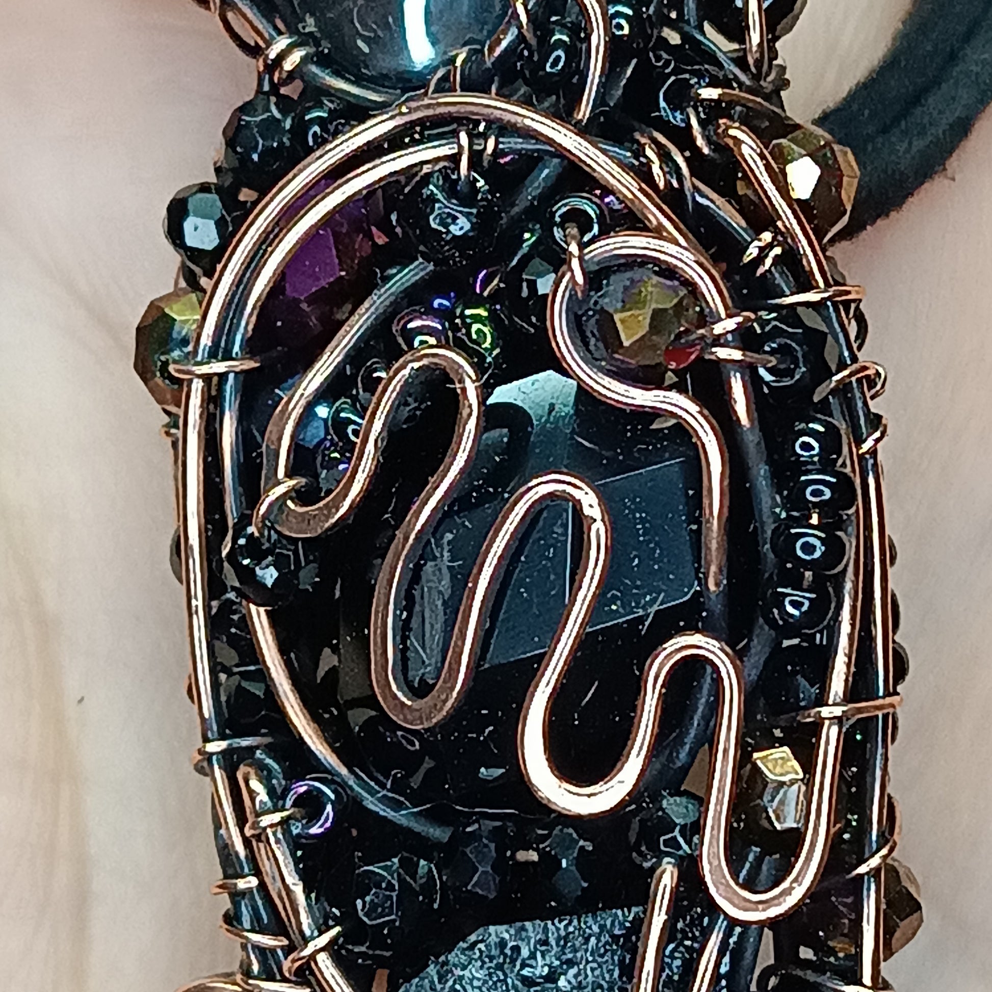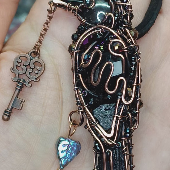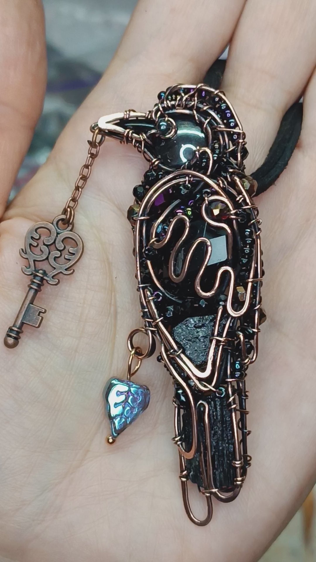 Wire wrapped raven necklace made of copper, black tourmaline, facetted onyx, hematites, glass beads and seed beads.