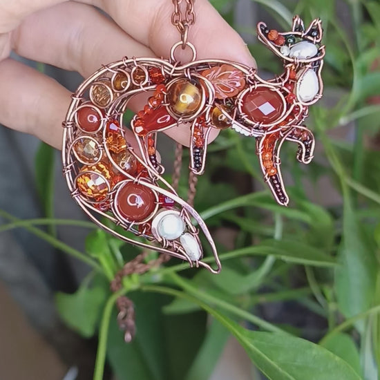 Wire wrapped copper foxy pendant with carbelians, pearls, spinel and glass beads.