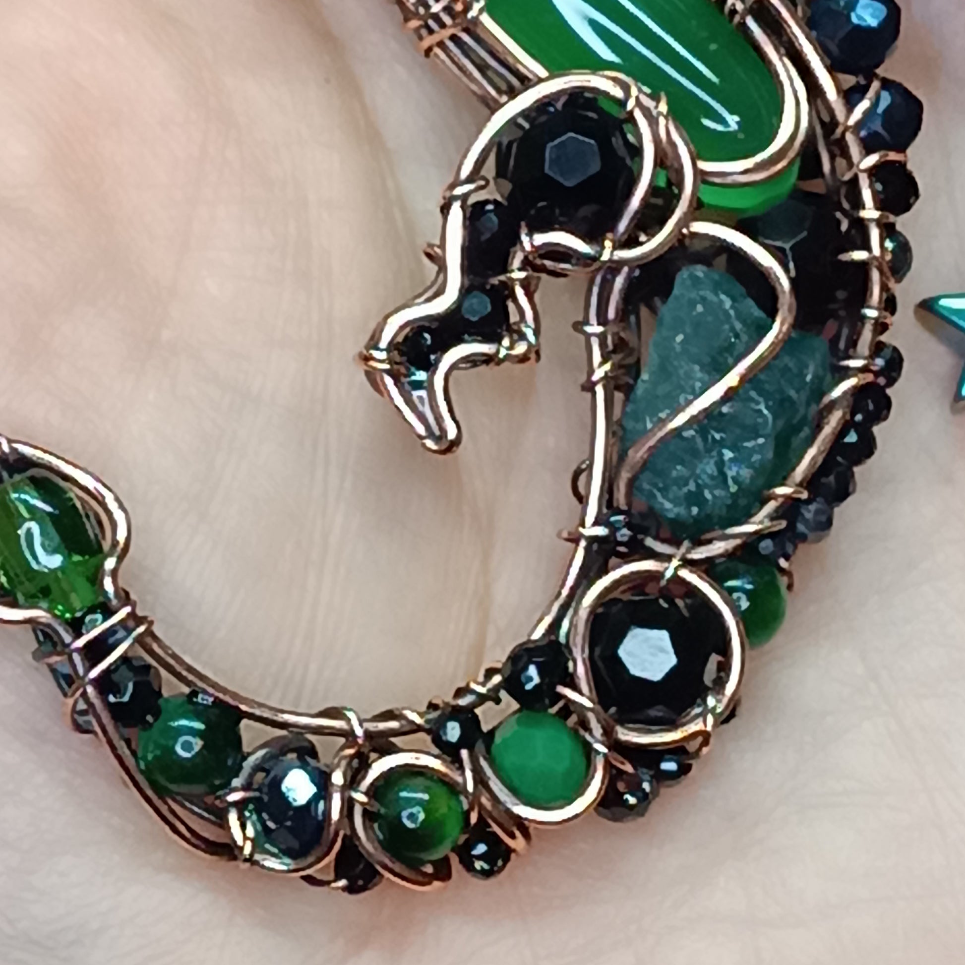 Made of copper, halcedony, apatite, tiger eye beads(dyed), chrome diopside beads, spinel and agate beads, glass beads, hematite stars.