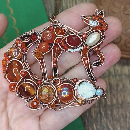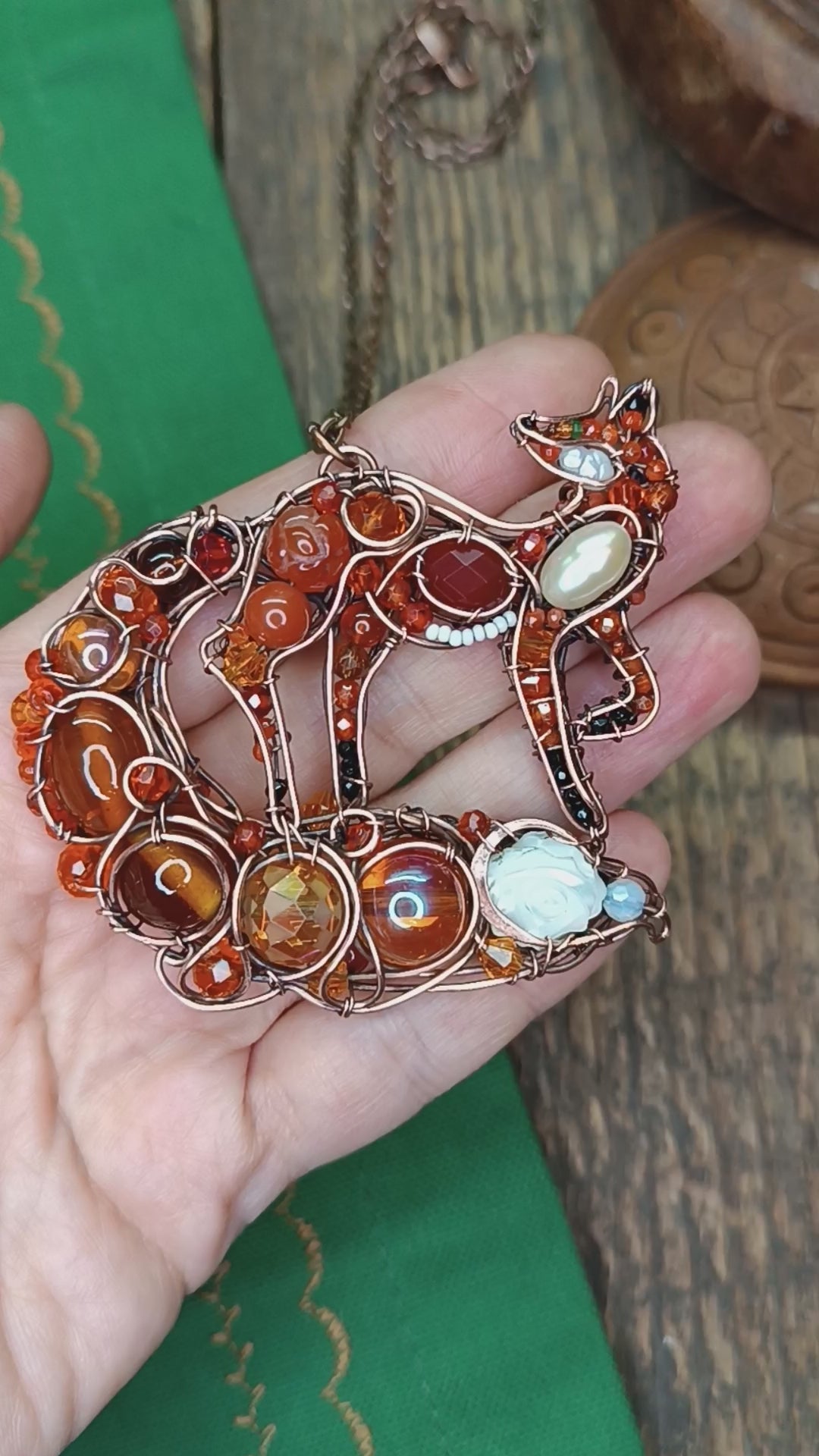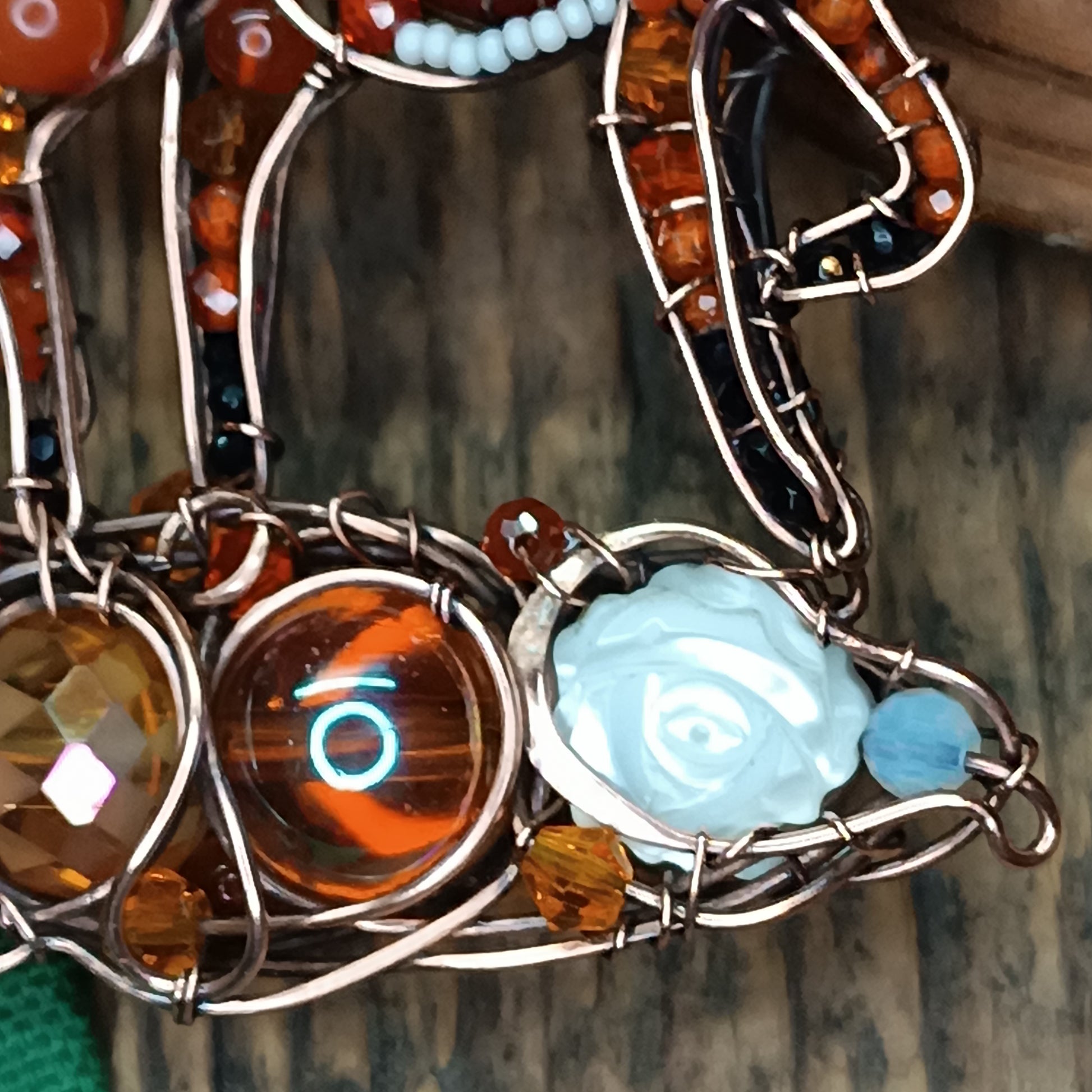 Copper, carnelians (smooth, faceted and carved), pearls, pressed shell rose, orange garnets, red jasper, spinel, opalite, zircon, glass beads.