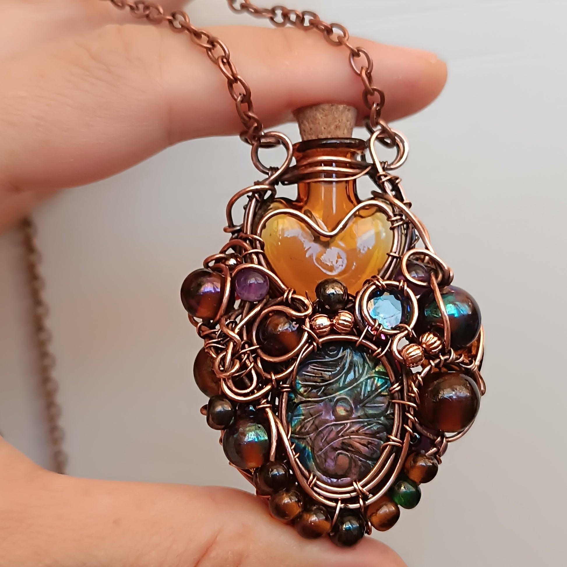 To make it I used copper wire and beads, glass bottle with cork, some amethysts and garnets, carved labradorite, glass cab, mystic topaz colour cubic zirconia and glass beads.