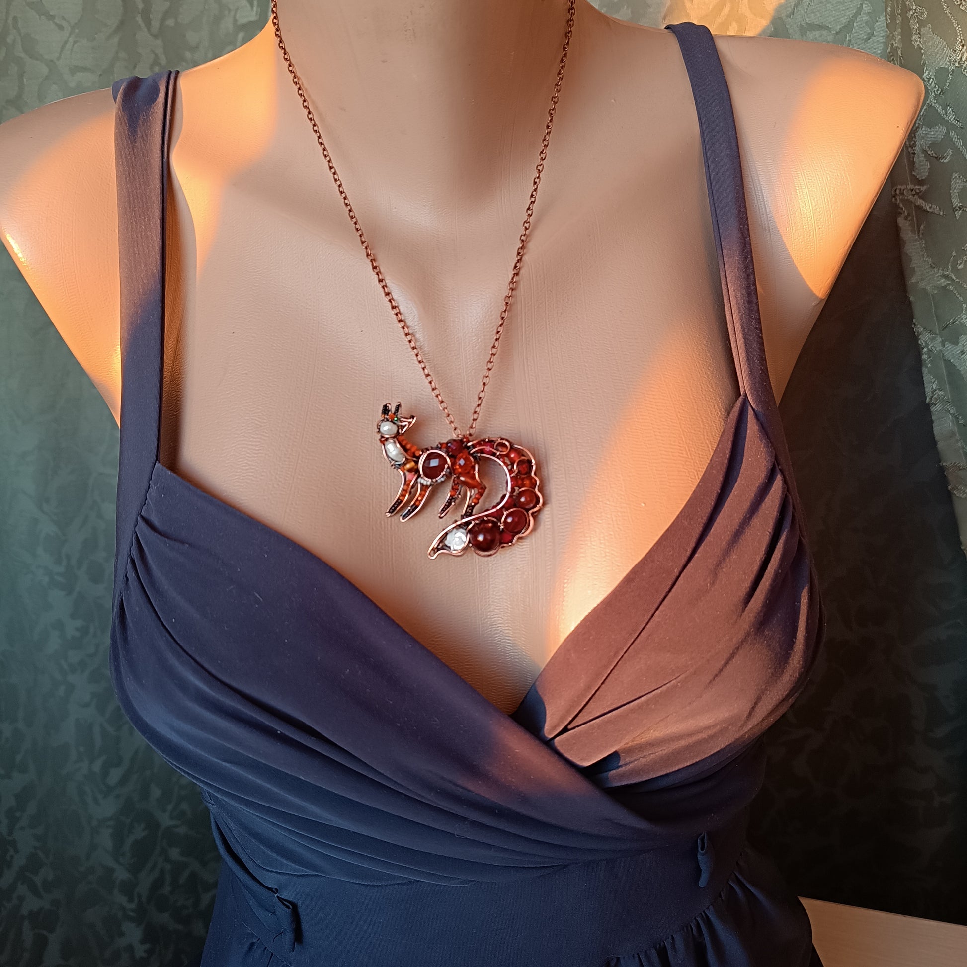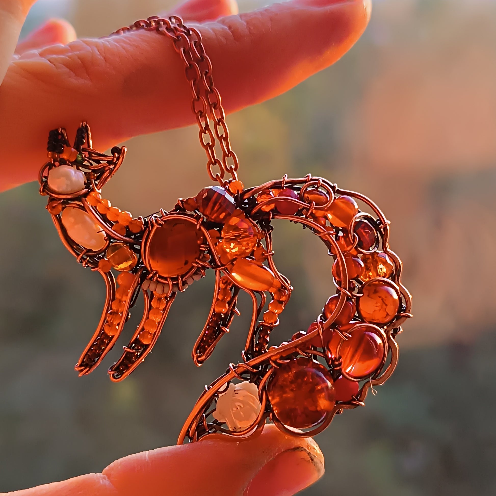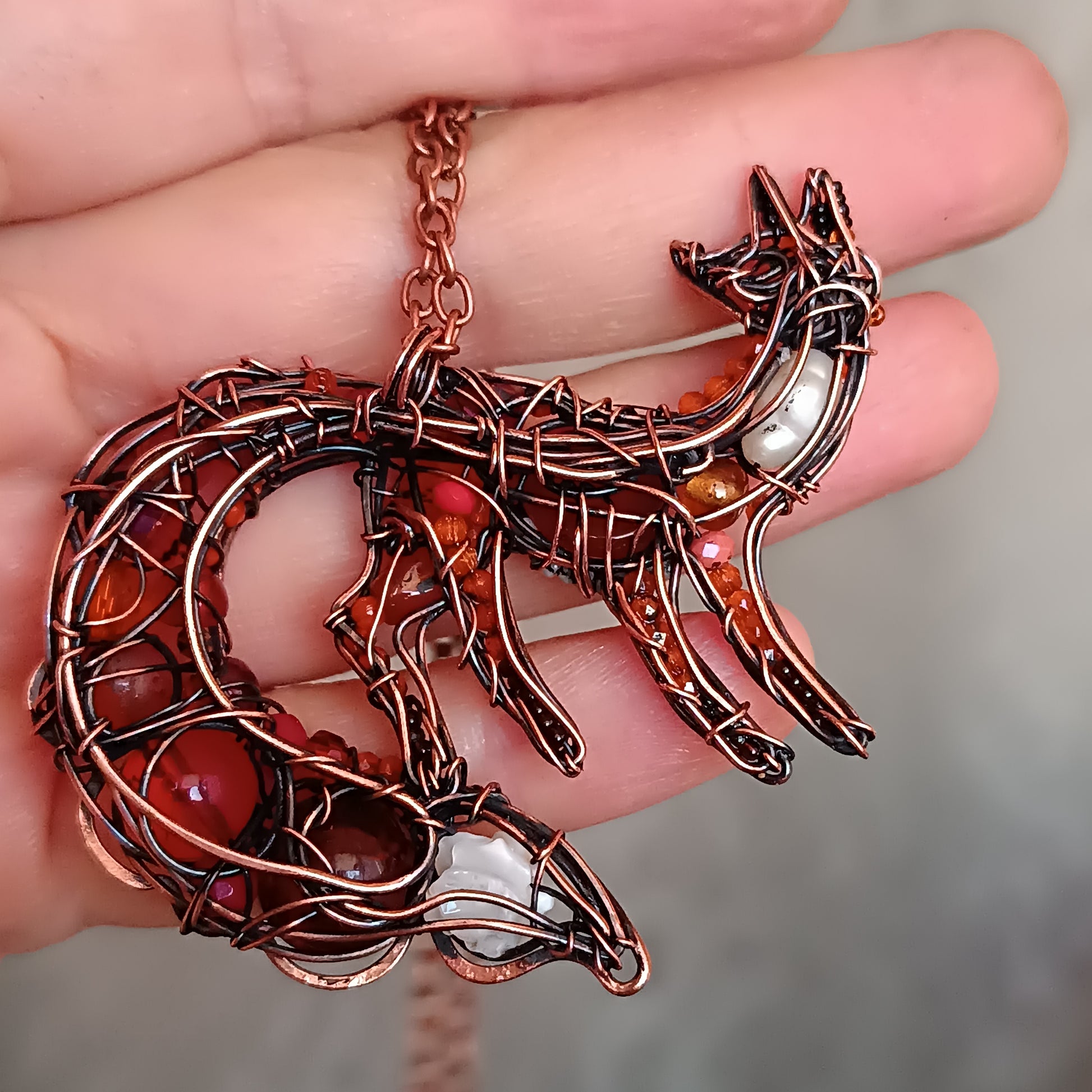 Wire wrapped copper fox pendant qith carnelians, pwarls, spinel, glass beads, plastic beads, seed beads.