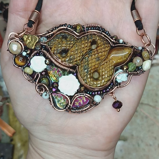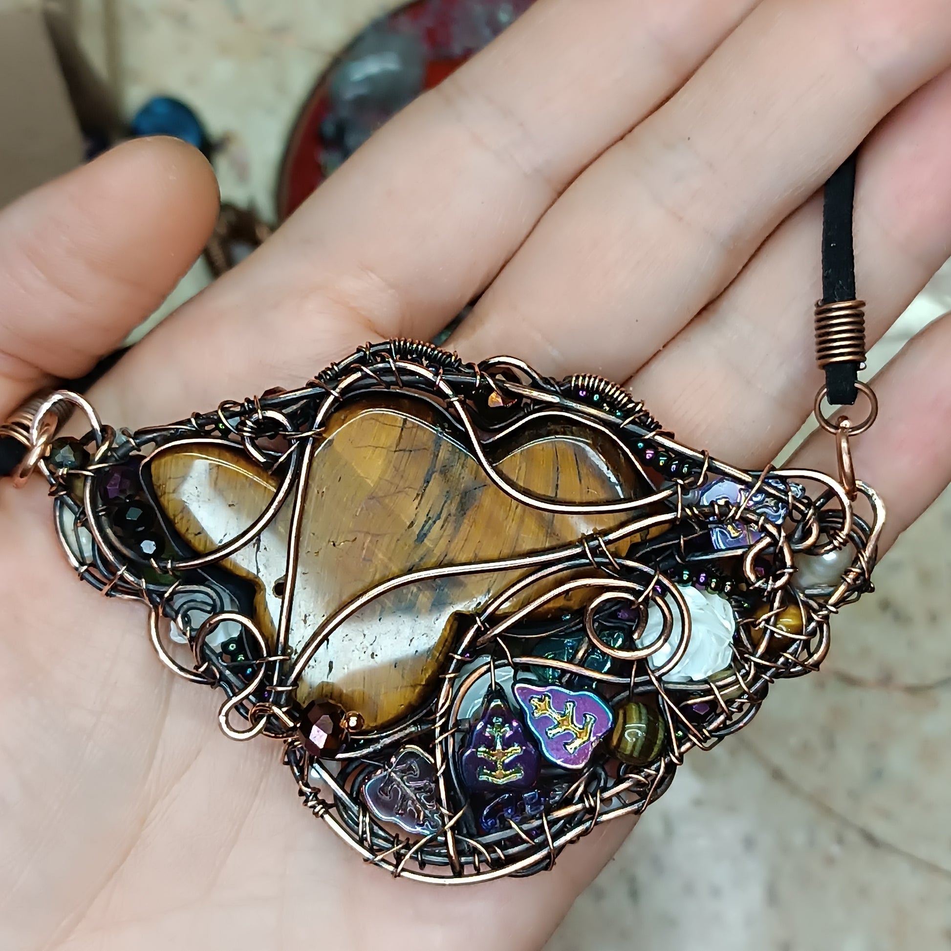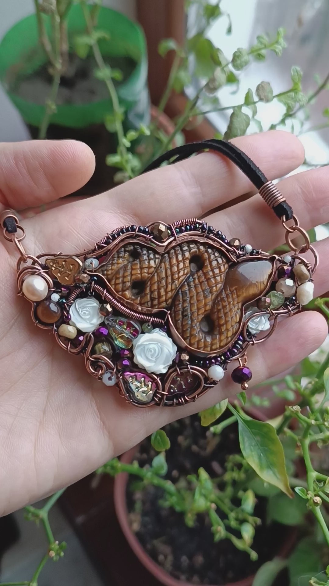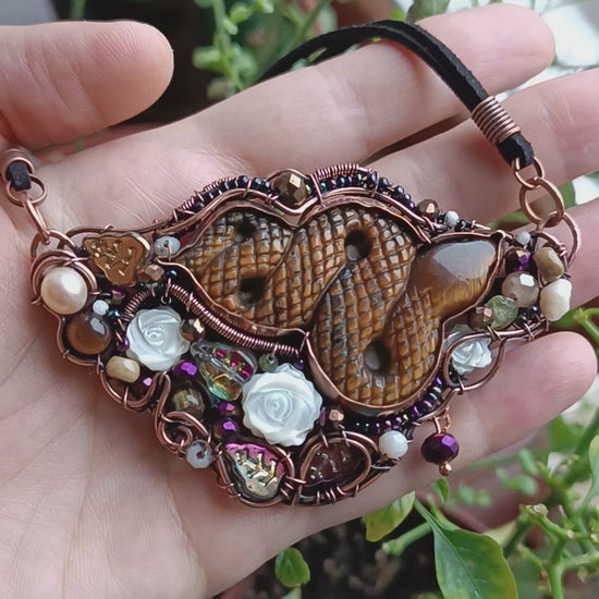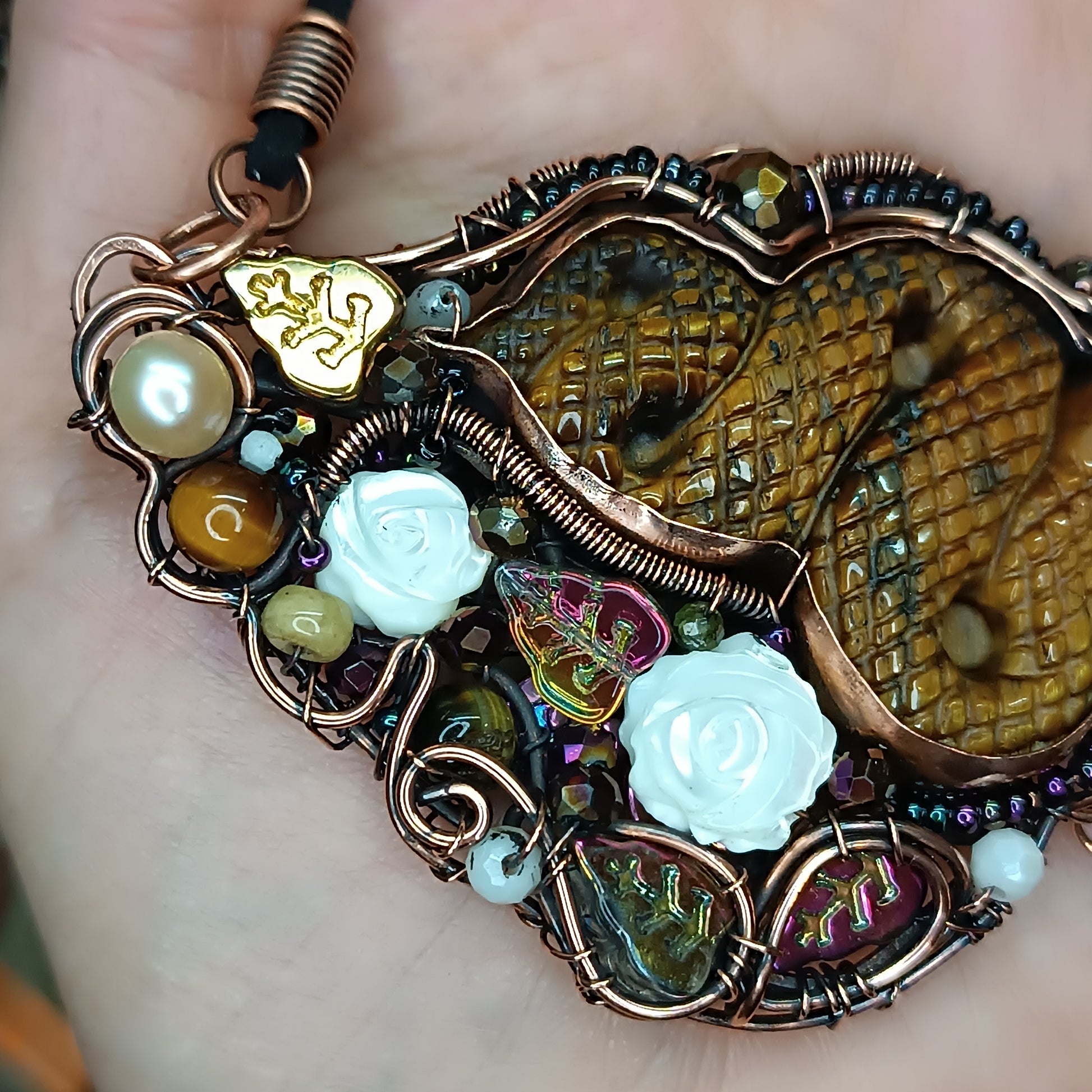 Copper, carved tiger eye, pearls,carved shell roses, peridots, tourmalines, belomorites(albites), glass beads, seed beads.