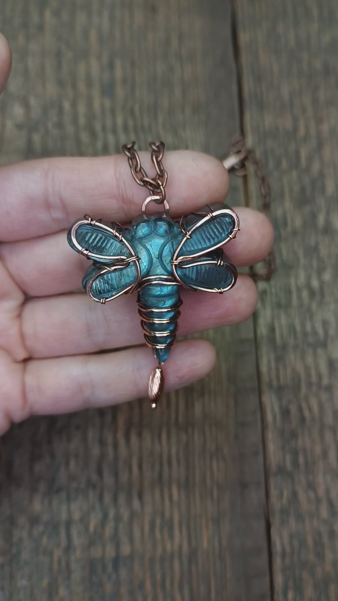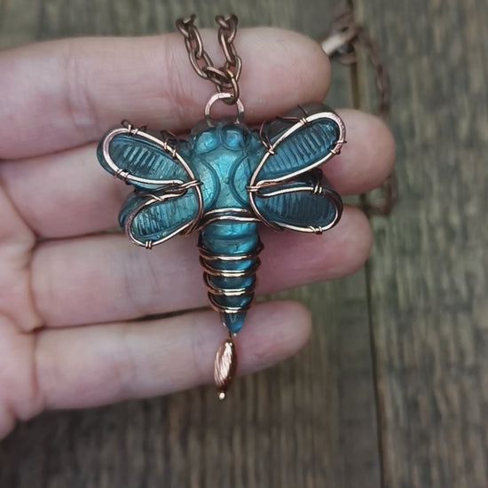Beautiful carved blue labradorite dragonfly wrapped elegantly with copper.
