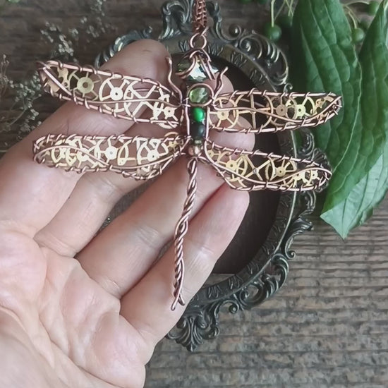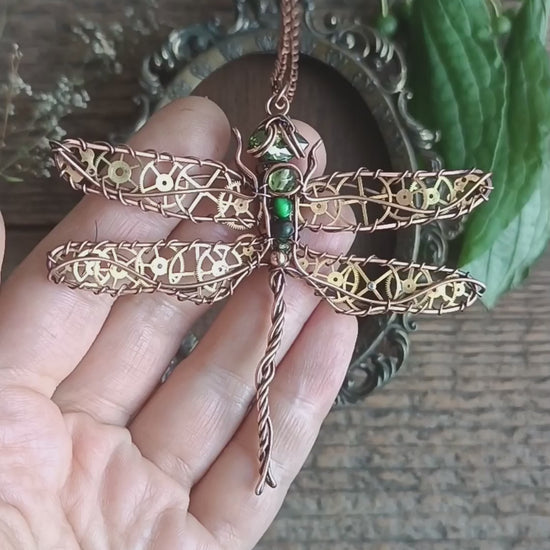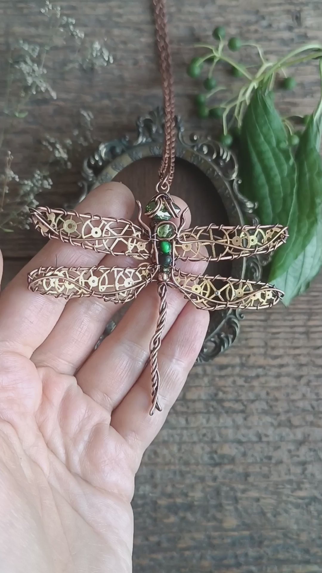 Green steampunky dragonfly with cubic zirconia head, peridot and dyed tigers eye back.