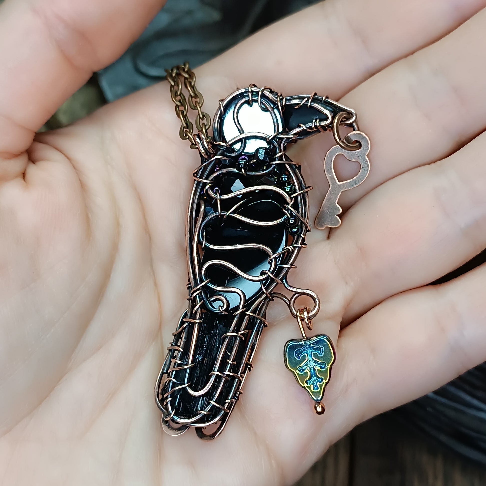 Copper, hematite, onyx, black tourmaline, zircons, glass beads, seed beads.