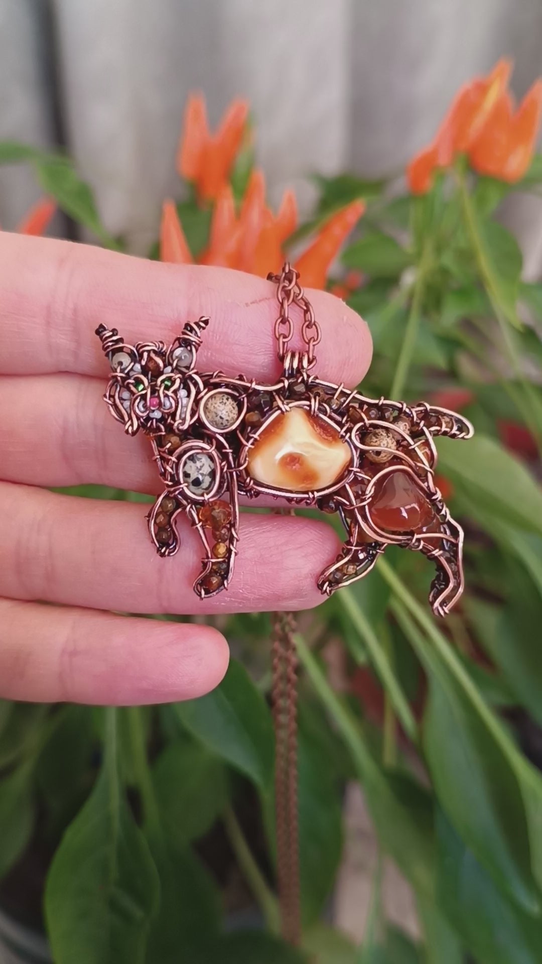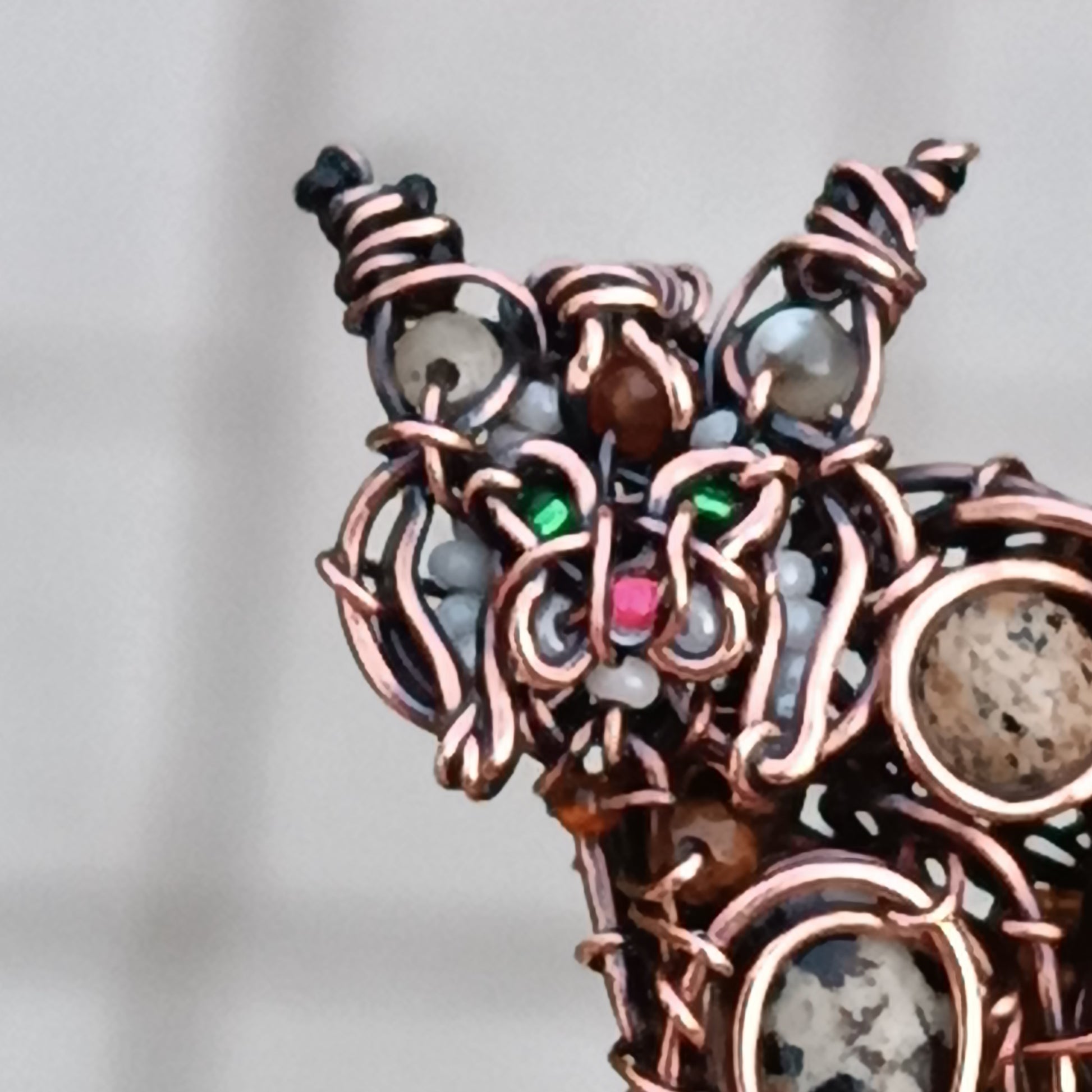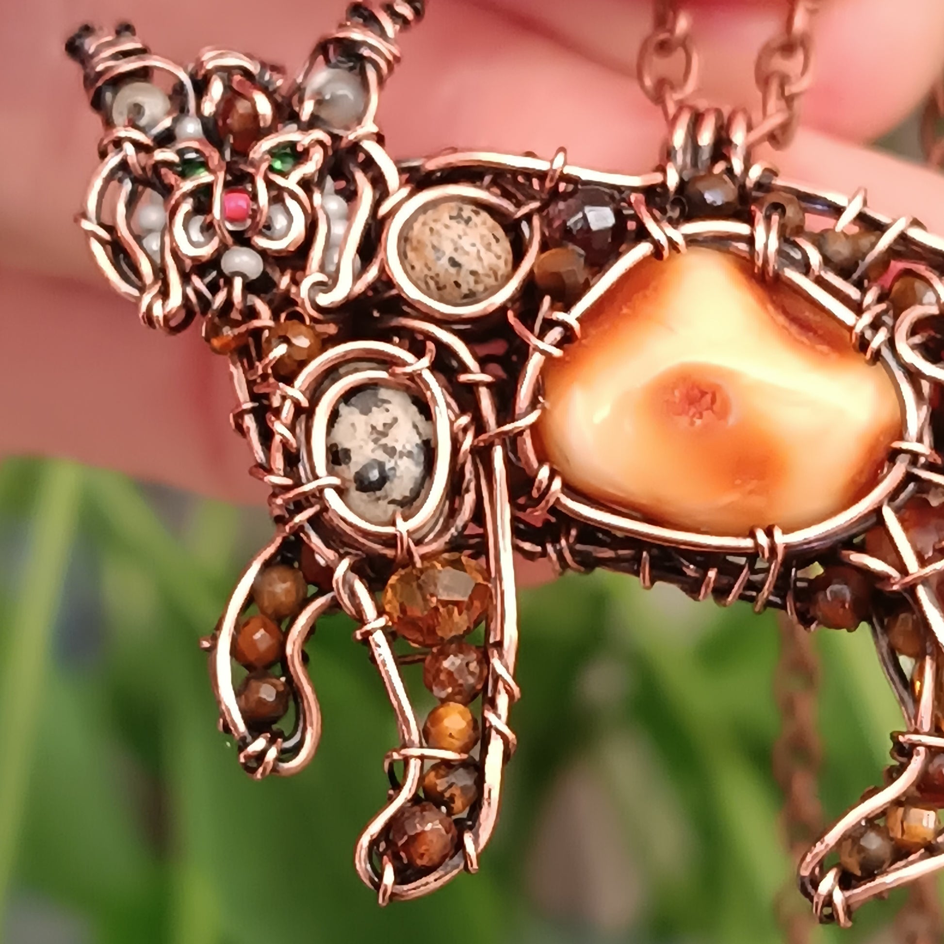 Media: copper wire, fire opal (in the back leg), honey mber with dots (I was so happy to find it, since it is not often that you find such dots), jasper (picture jusper and dalmation jusper), facetted tiger eye beads, facetted aventurine beads, mother of pearl beads (ears), tiny Japanese seed beads.
