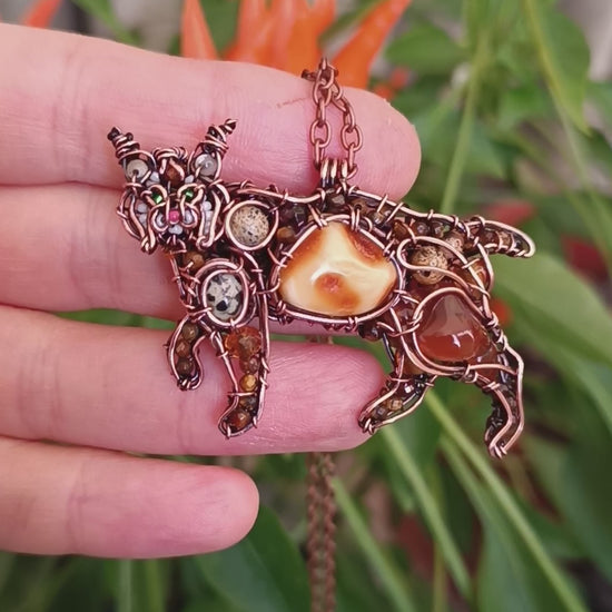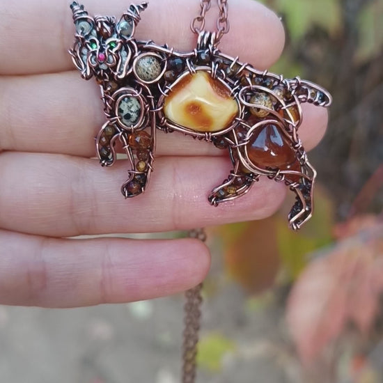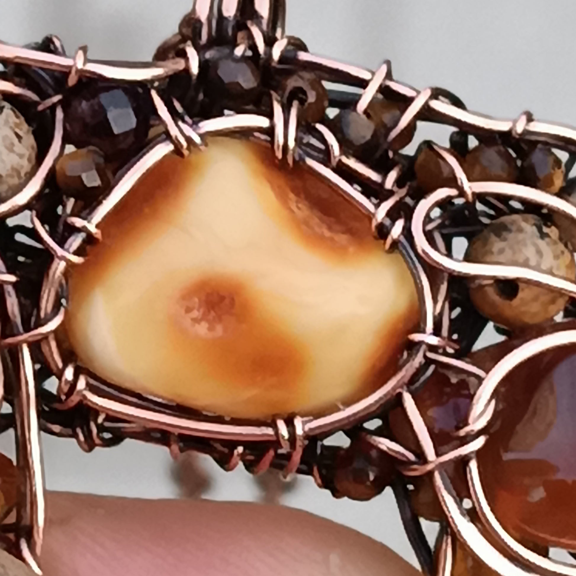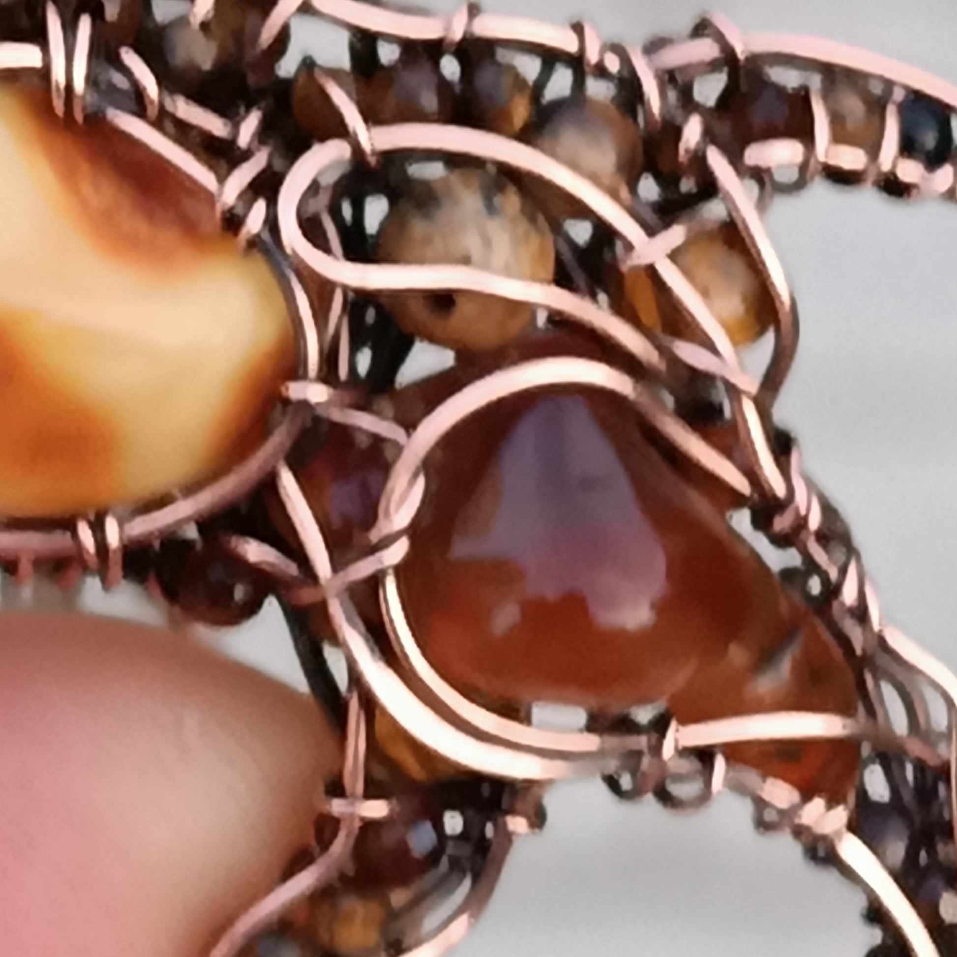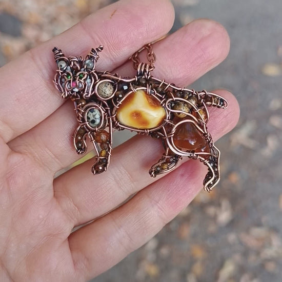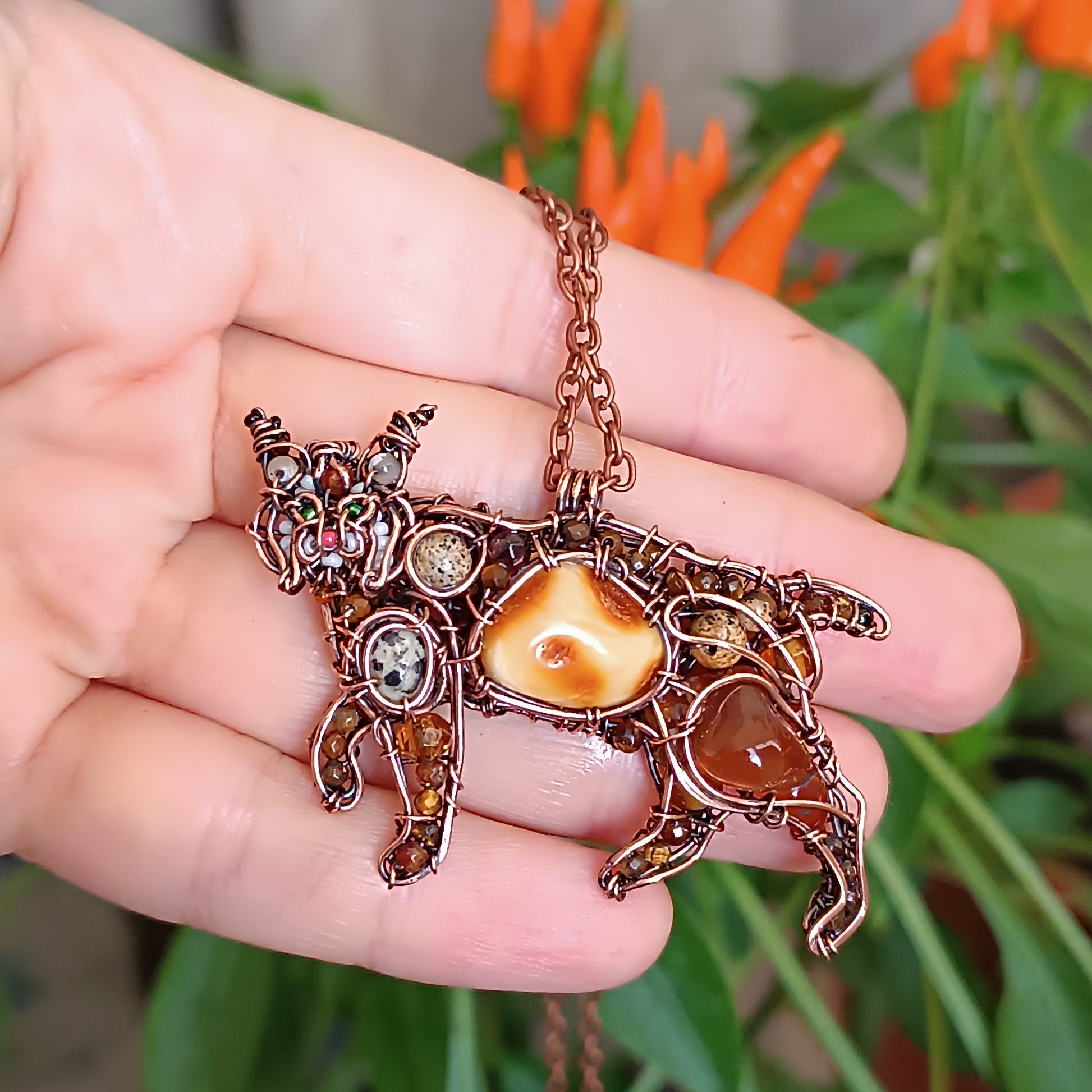 Media: copper wire, fire opal (in the back leg), honey mber with dots (I was so happy to find it, since it is not often that you find such dots), jasper (picture jusper and dalmation jusper), facetted tiger eye beads, facetted aventurine beads, mother of pearl beads (ears), tiny Japanese seed beads.