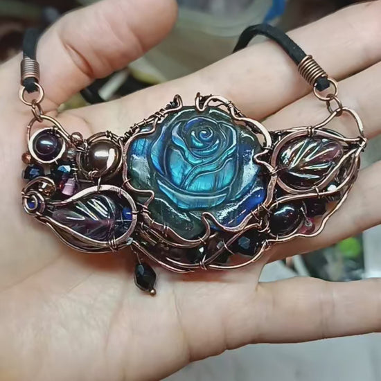 Carved labradorite rose, natural black pearls, glass beads. And 18" faux suede cord.