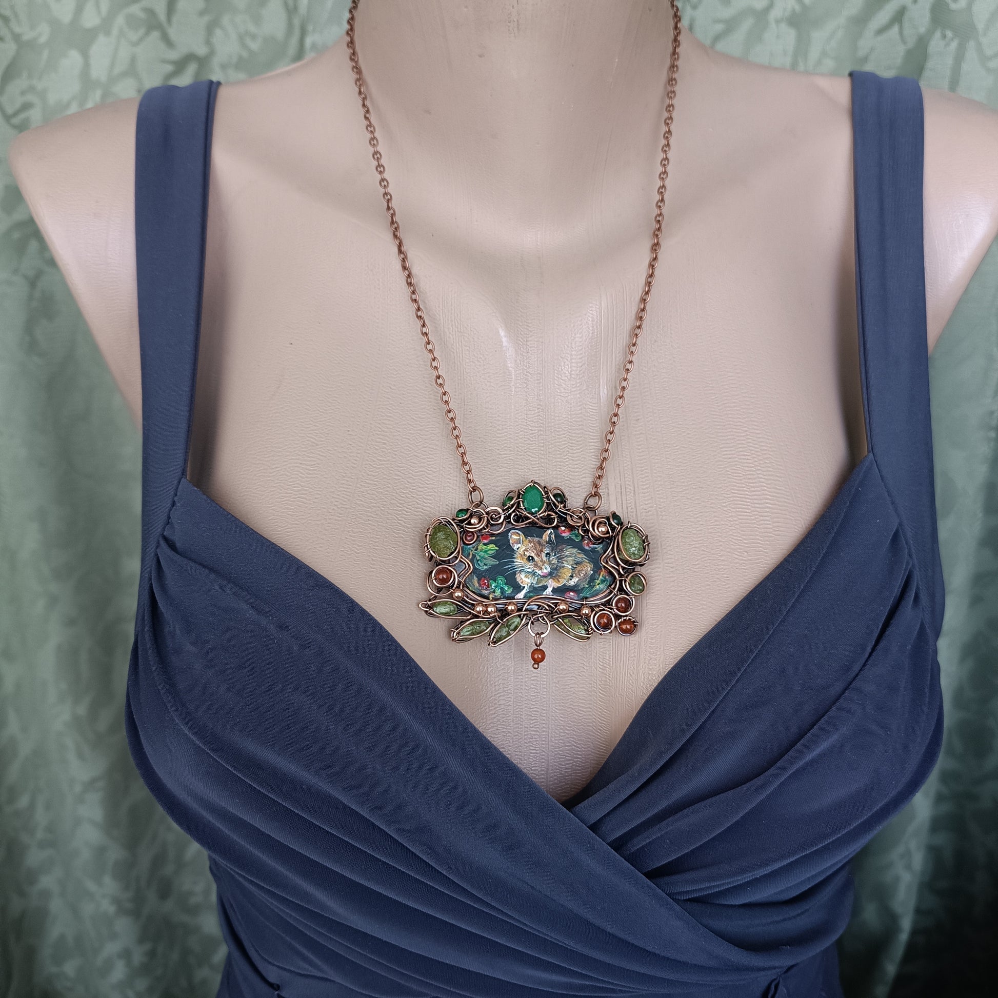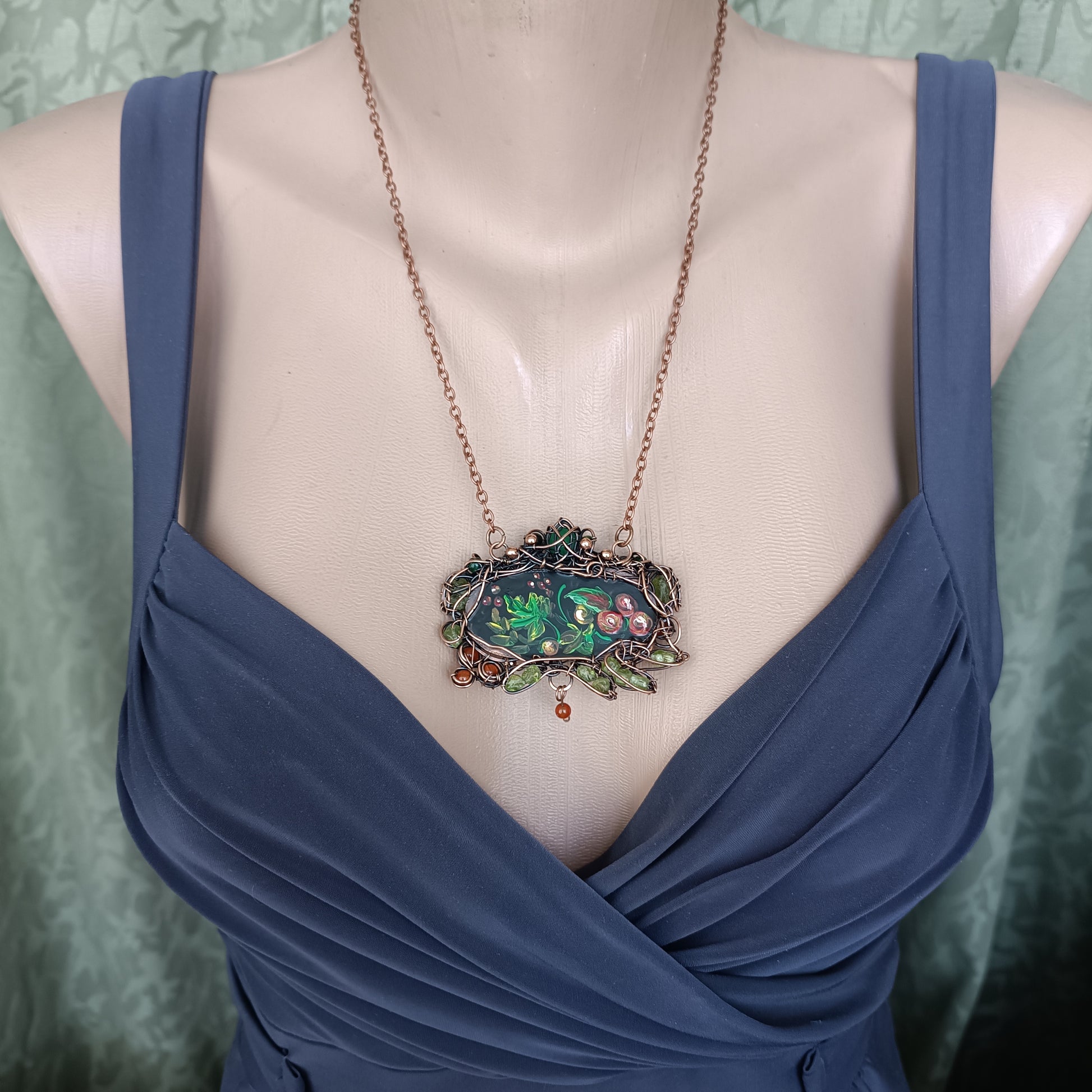Copper, carnelians, peridots, jadeite, dyed tiger eye, acrylic piants, gloss varnish.