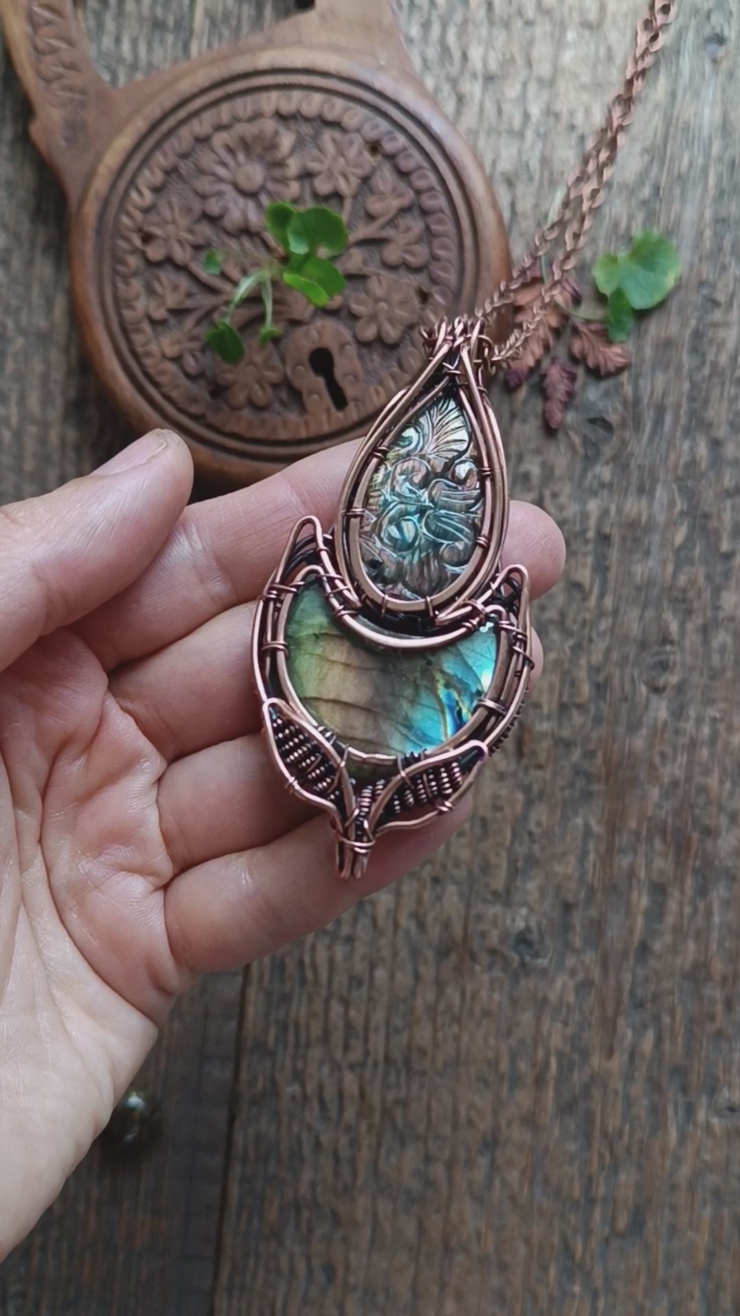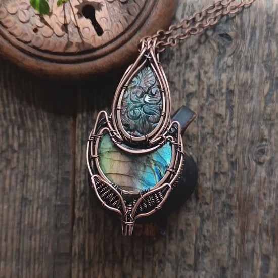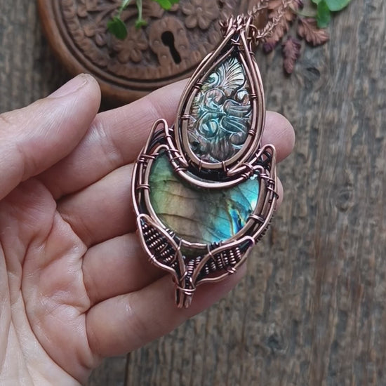 Beautiful carved labradorite showing pink, yellow and purple flash (not at all angles) and full flash blue and yellow moon labradorite, all shaped in a floral necklace, which reminds me of a lotus bud a lot!