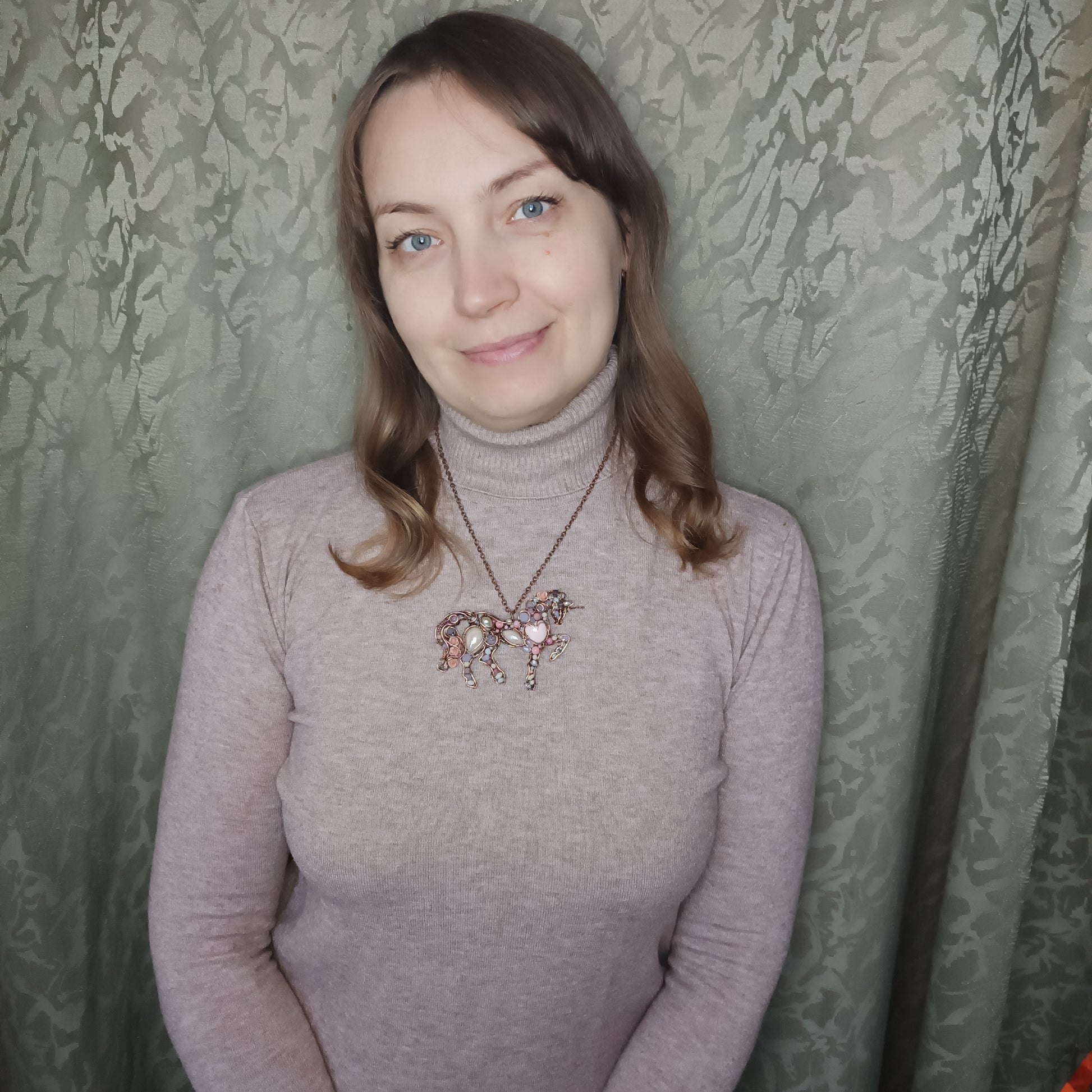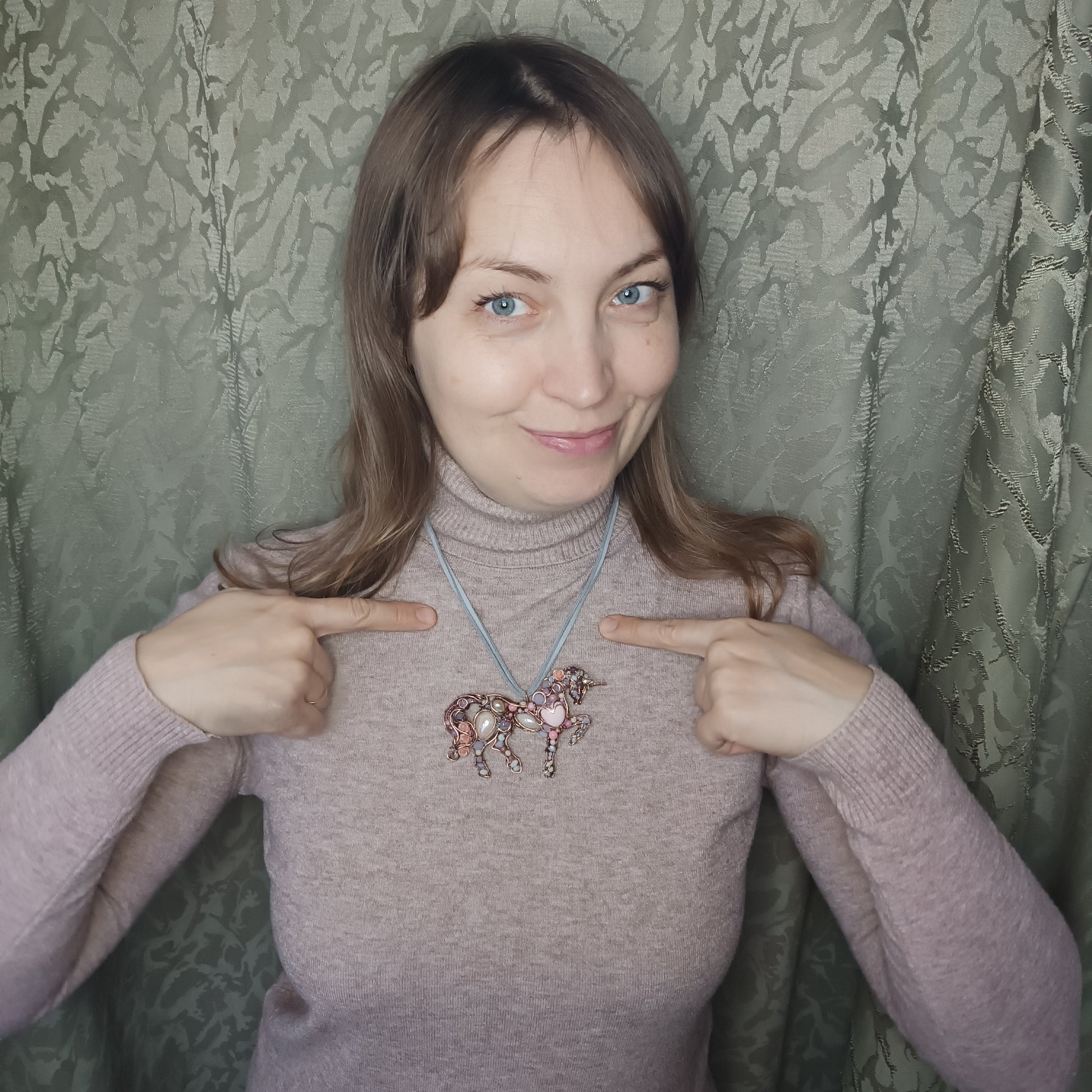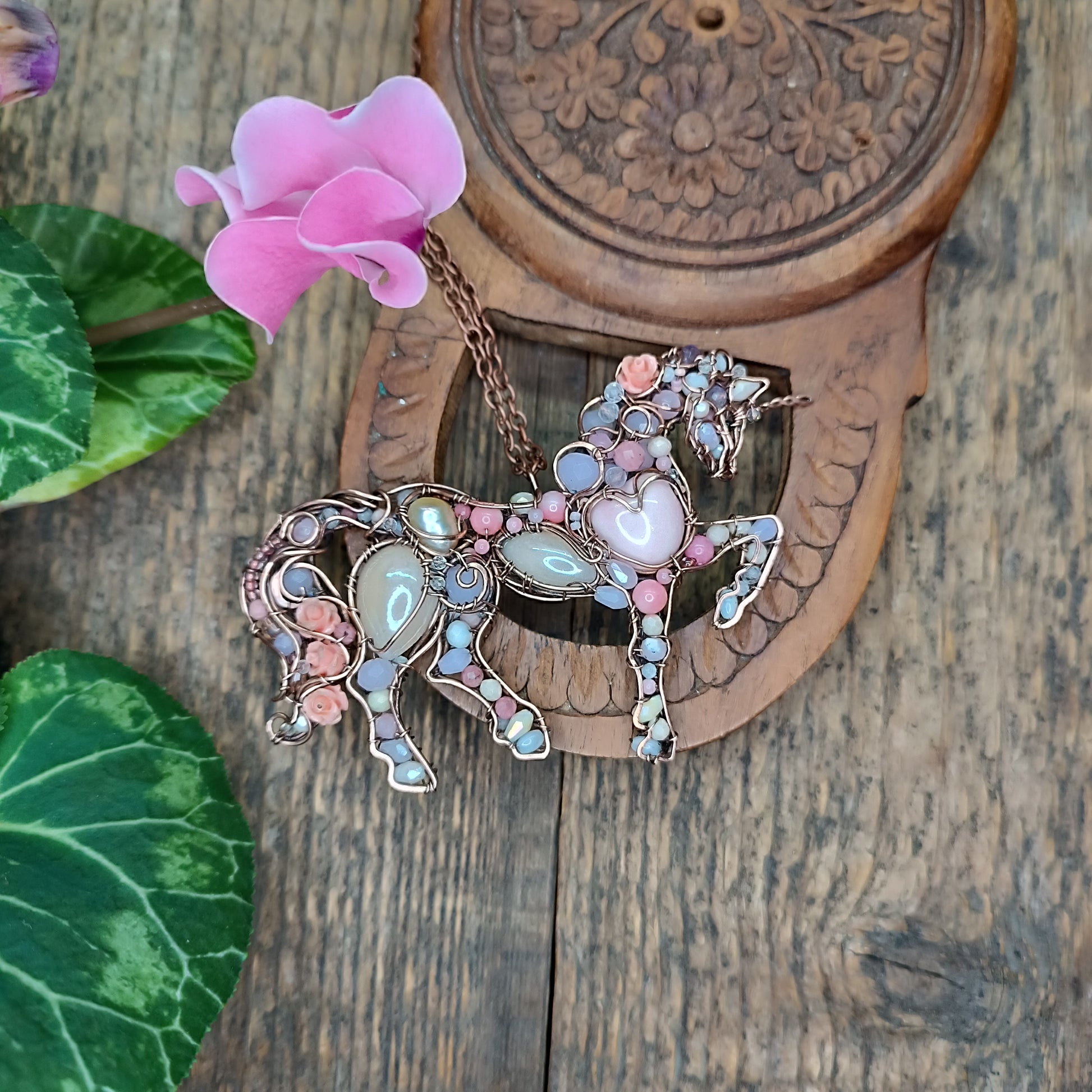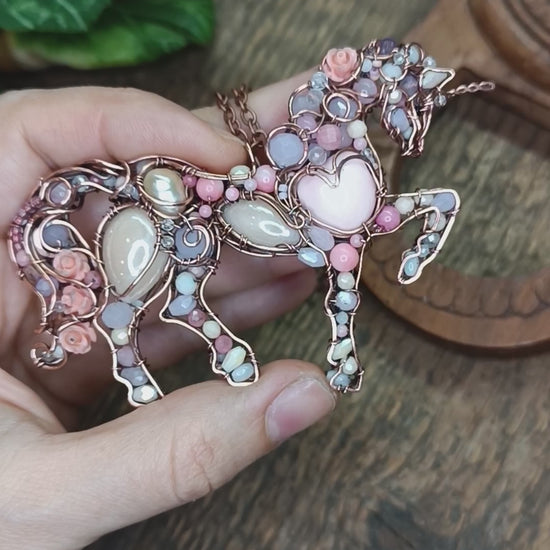 My unicorn pendant is made of copper, pink opals, rhodonites, rose quartz, pearl, porcelain cabs, bamboo corals, moonstones, zircons, spinel, lavender amethyst s, quartz, mother of pearls, glass beads, seed beads, pressed shell roses.