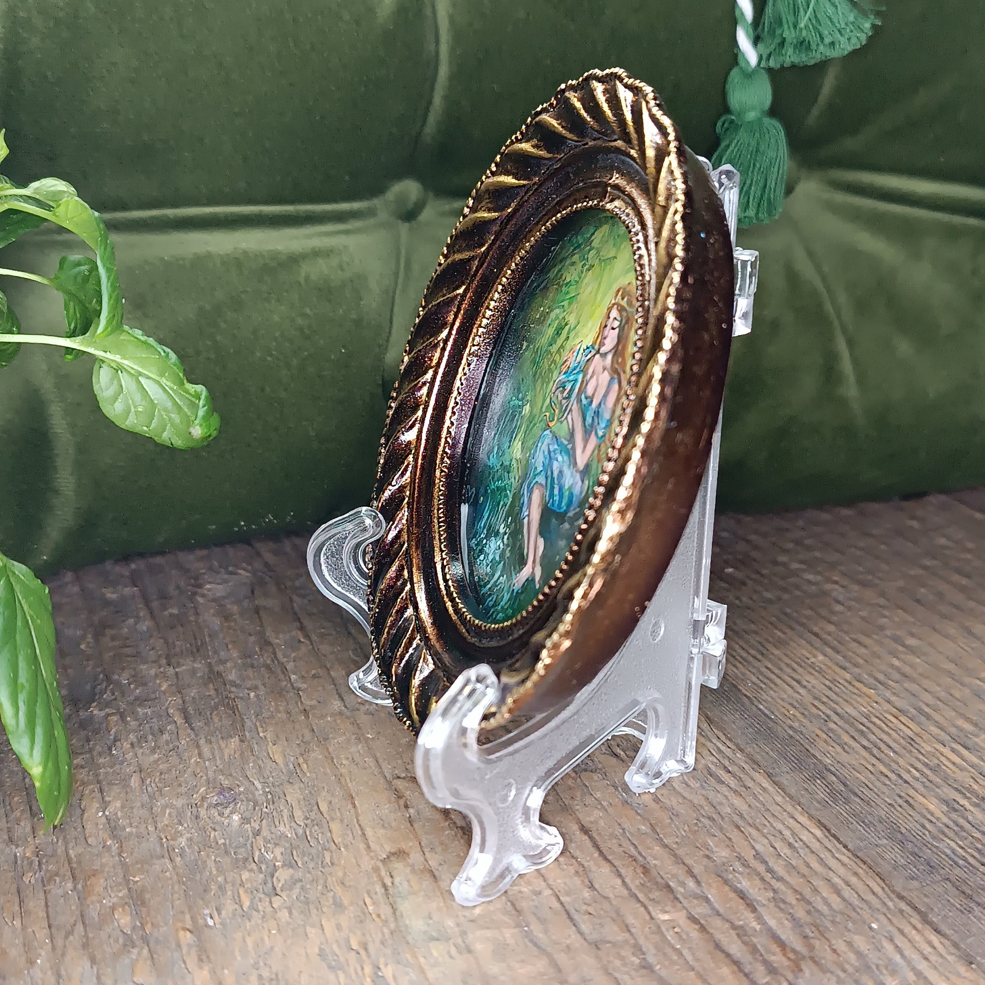 Acrylic painting on wood. Sealed with the protection gloss and protected with the frame's glass.