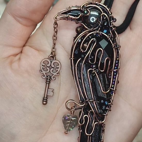 Wire wrapped raven necklace made of copper, black tourmaline, facetted onyx, hematites, glass beads and seed beads.