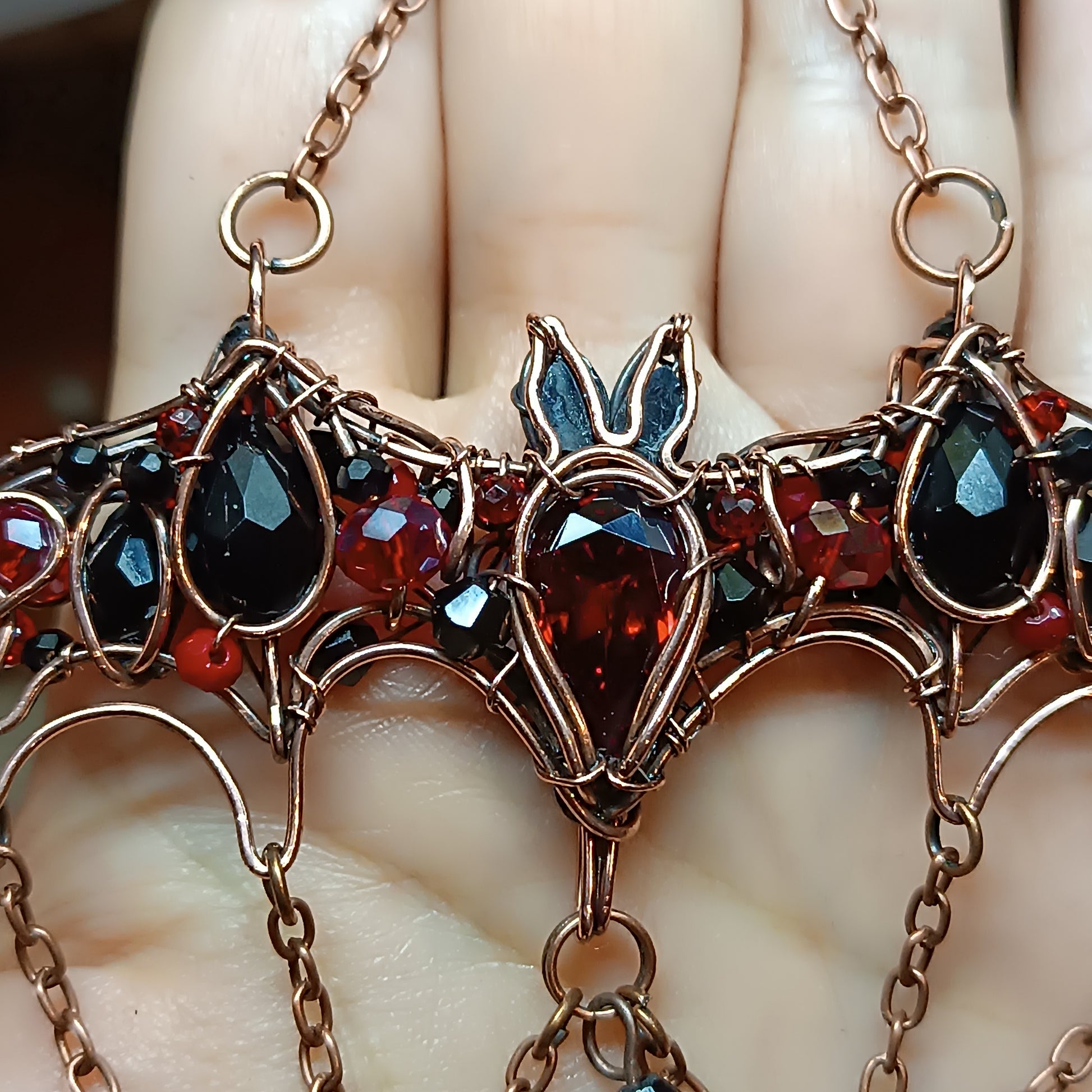 Copper bat made in wire wrapping technique and adorned with spinel, cubic zirconia and glass beads.