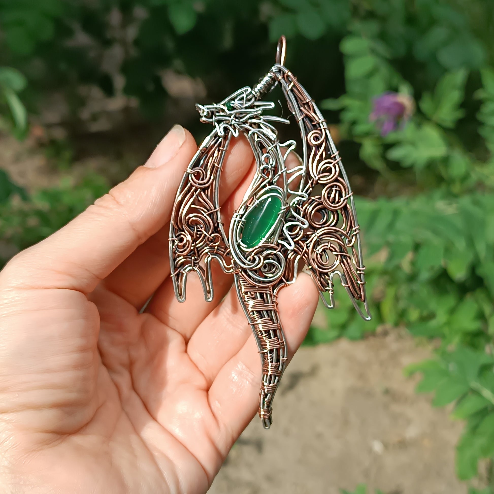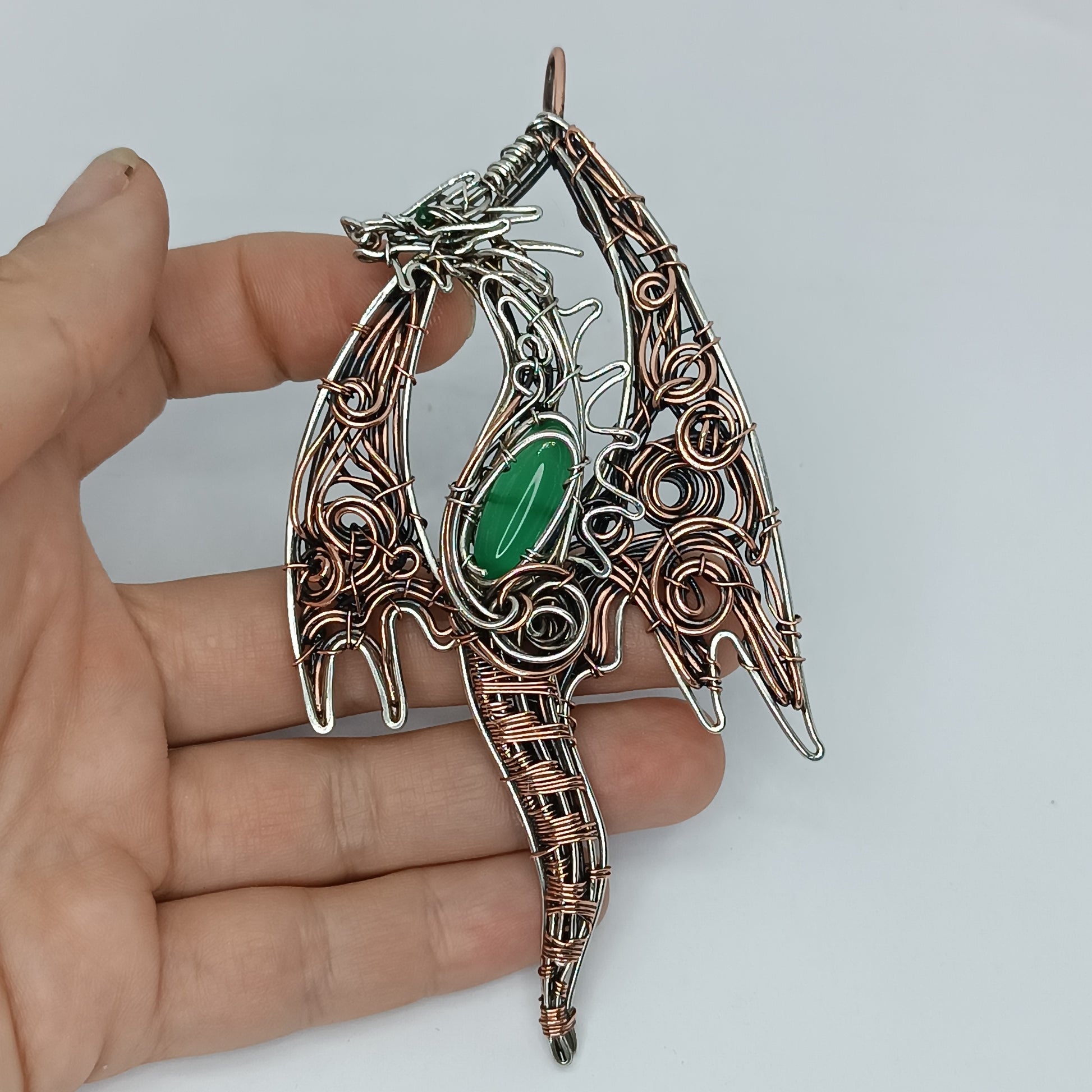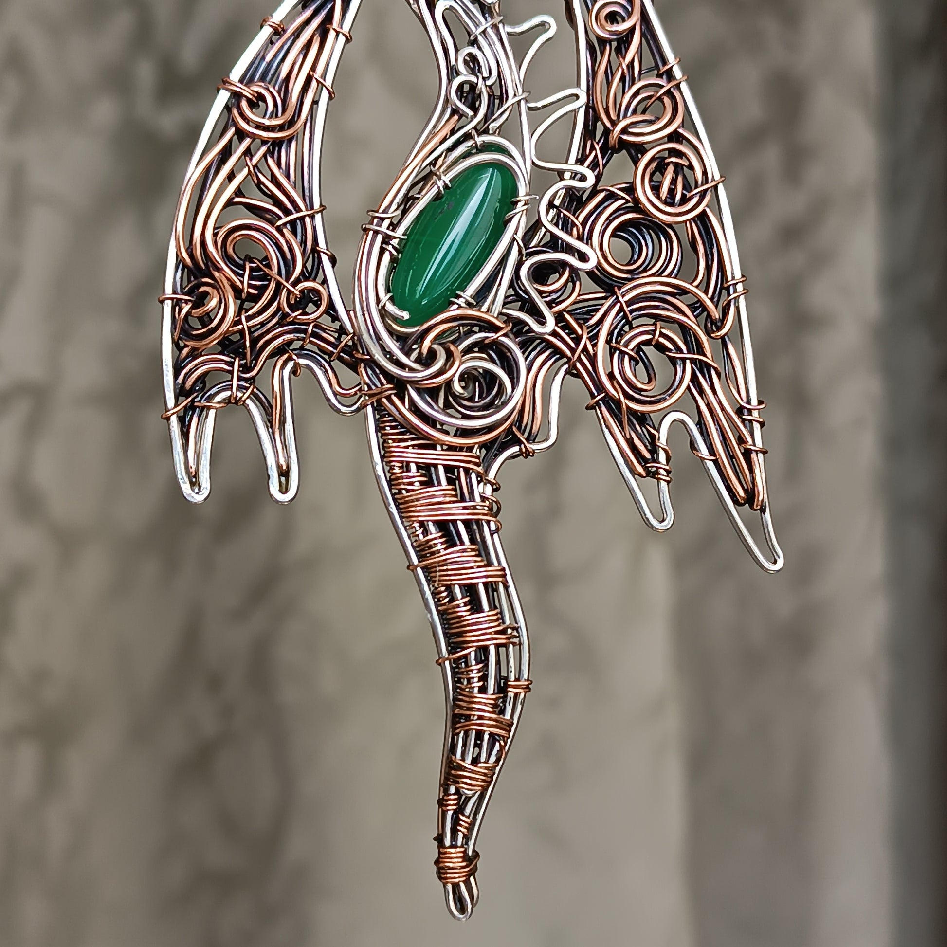 925 silver and pure copper wrapped together in a shape of a dragon. The central cabochon is green chalcedony.