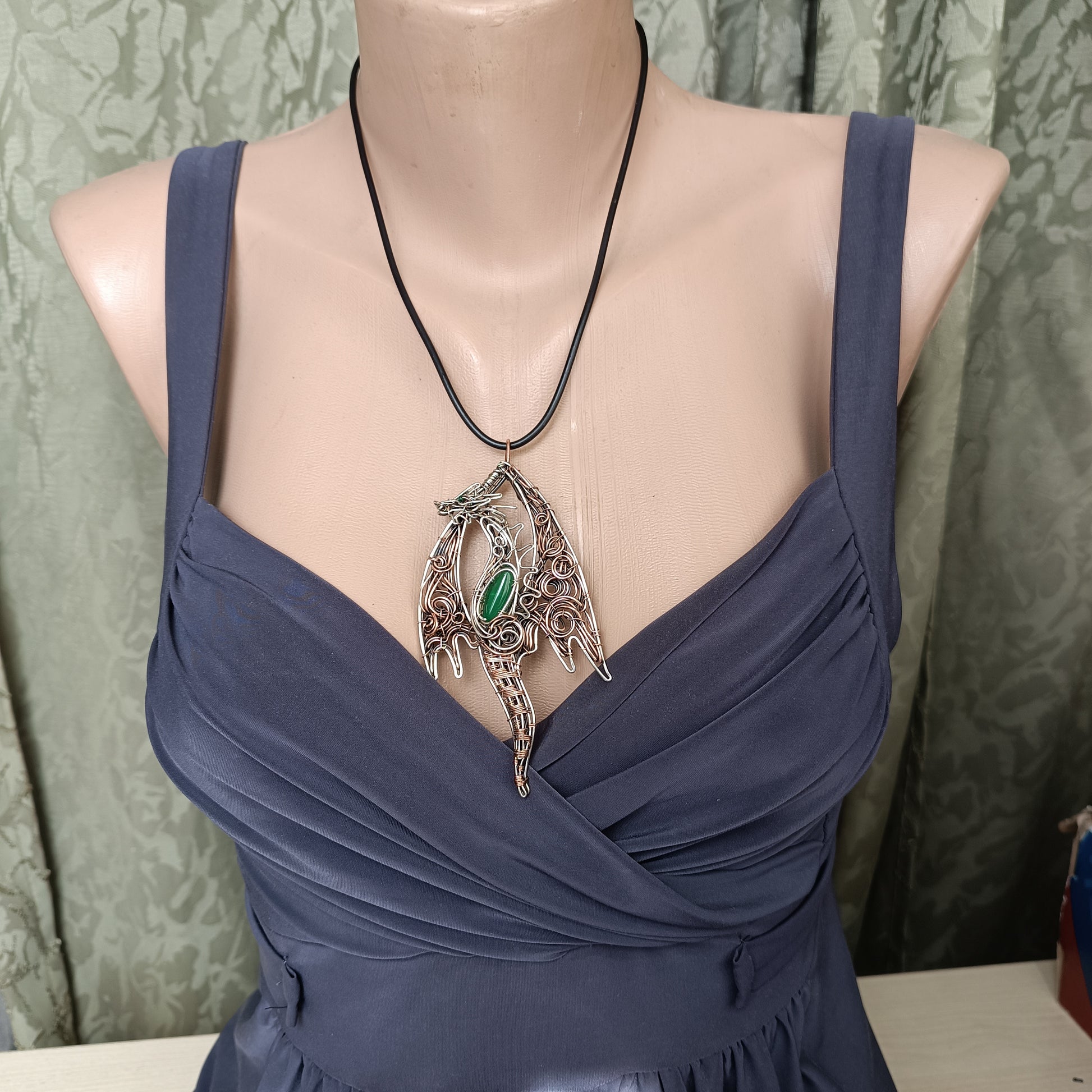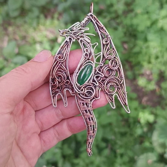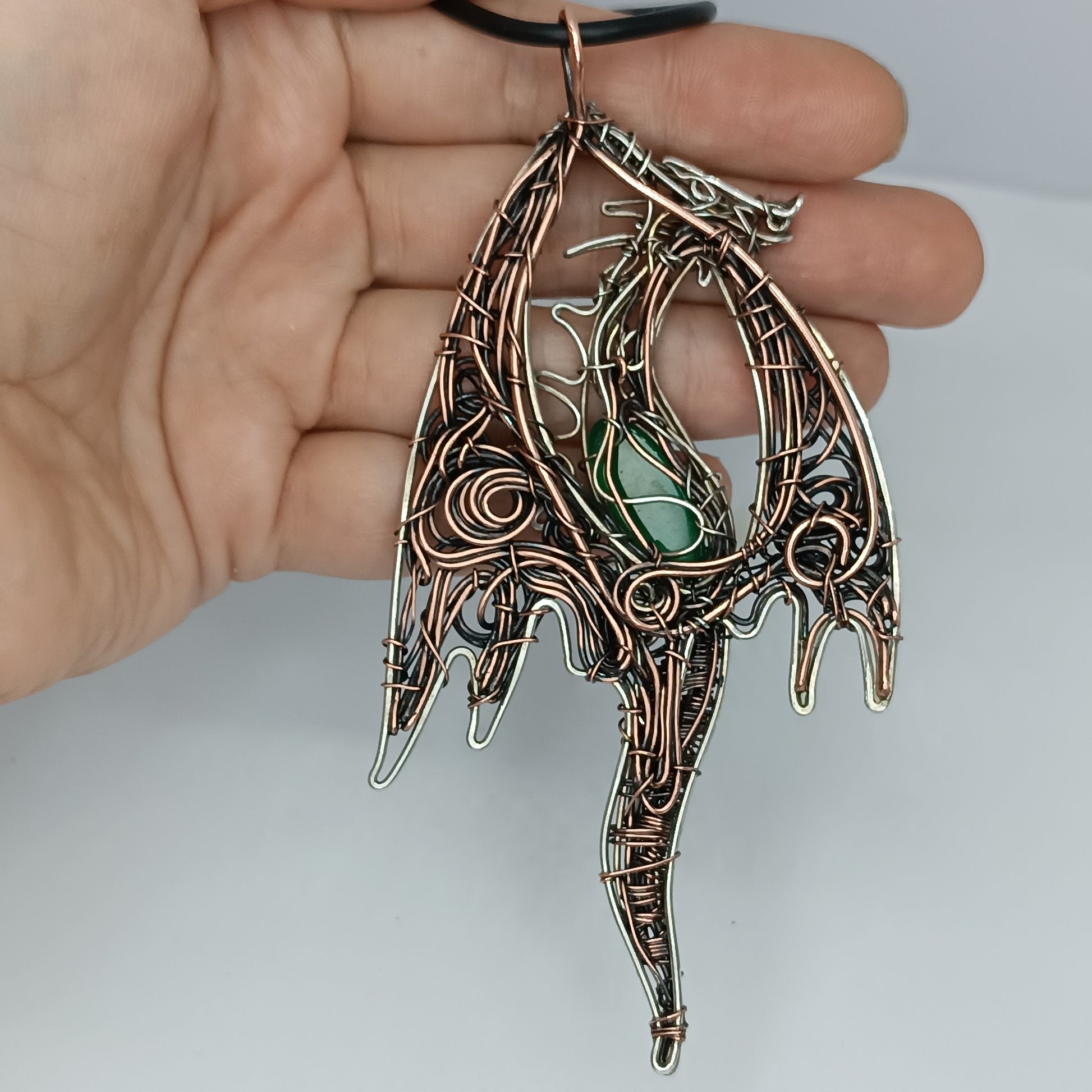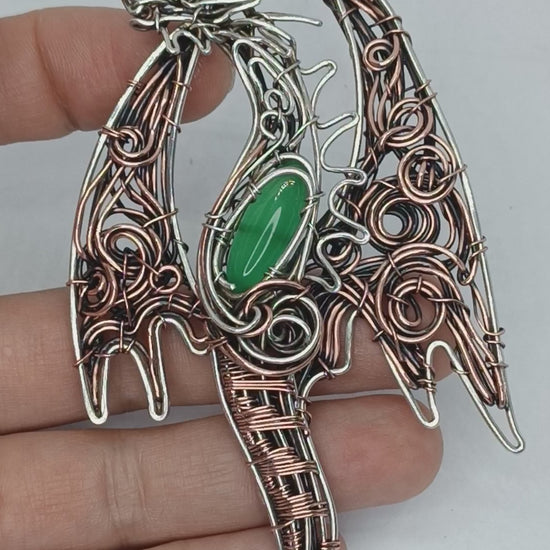 925 silver and pure copper wrapped together in a shape of a dragon. The central cabochon is green chalcedony.