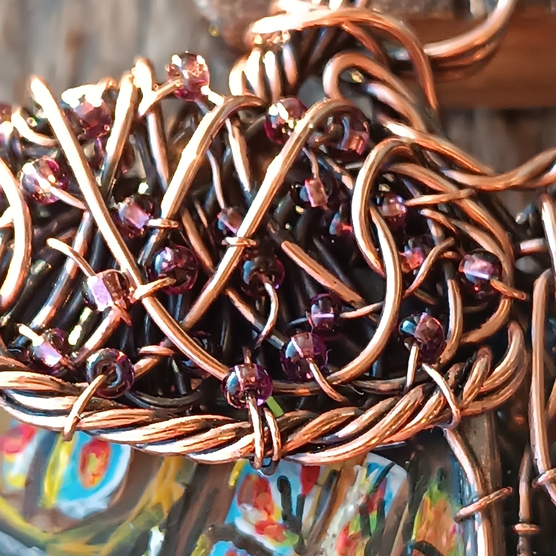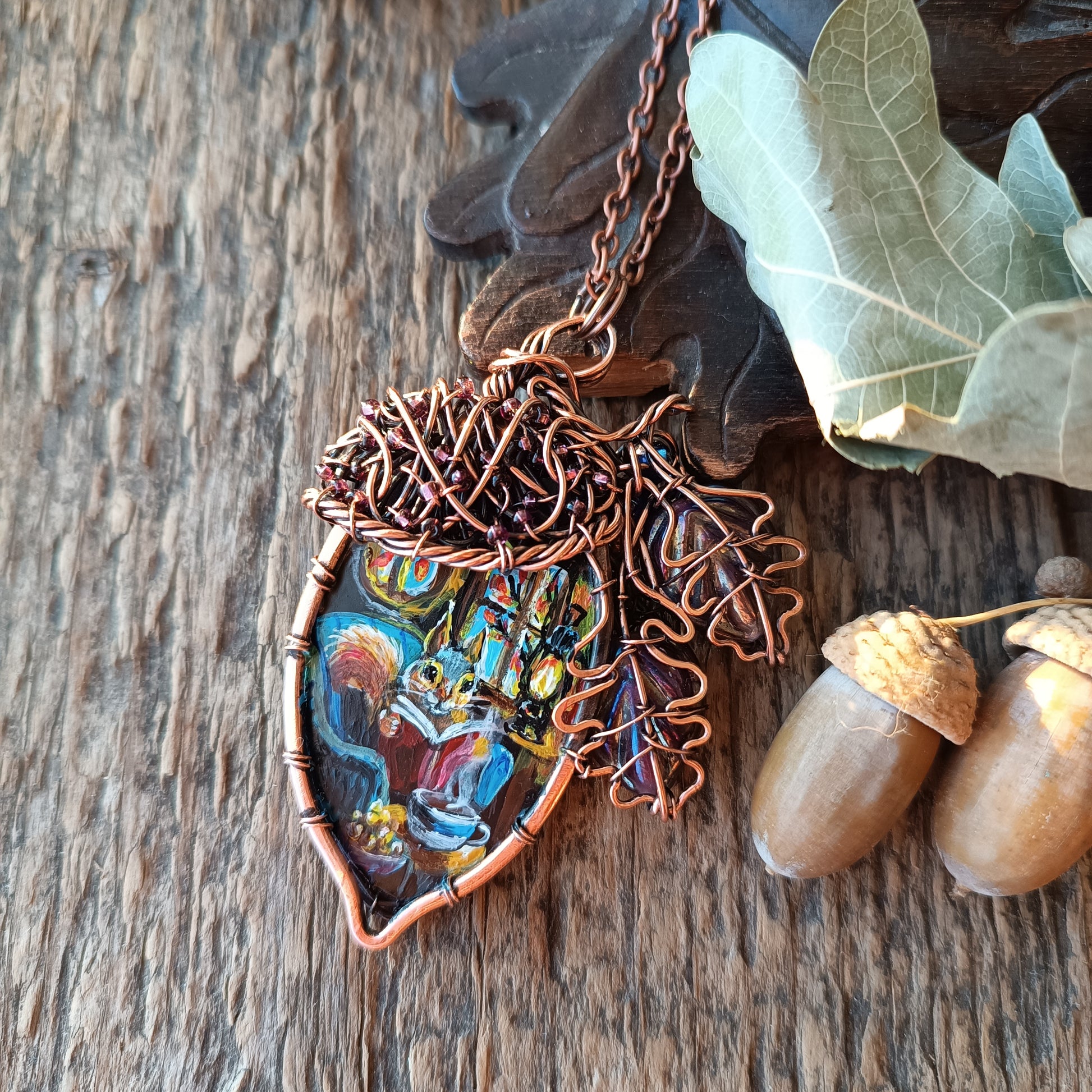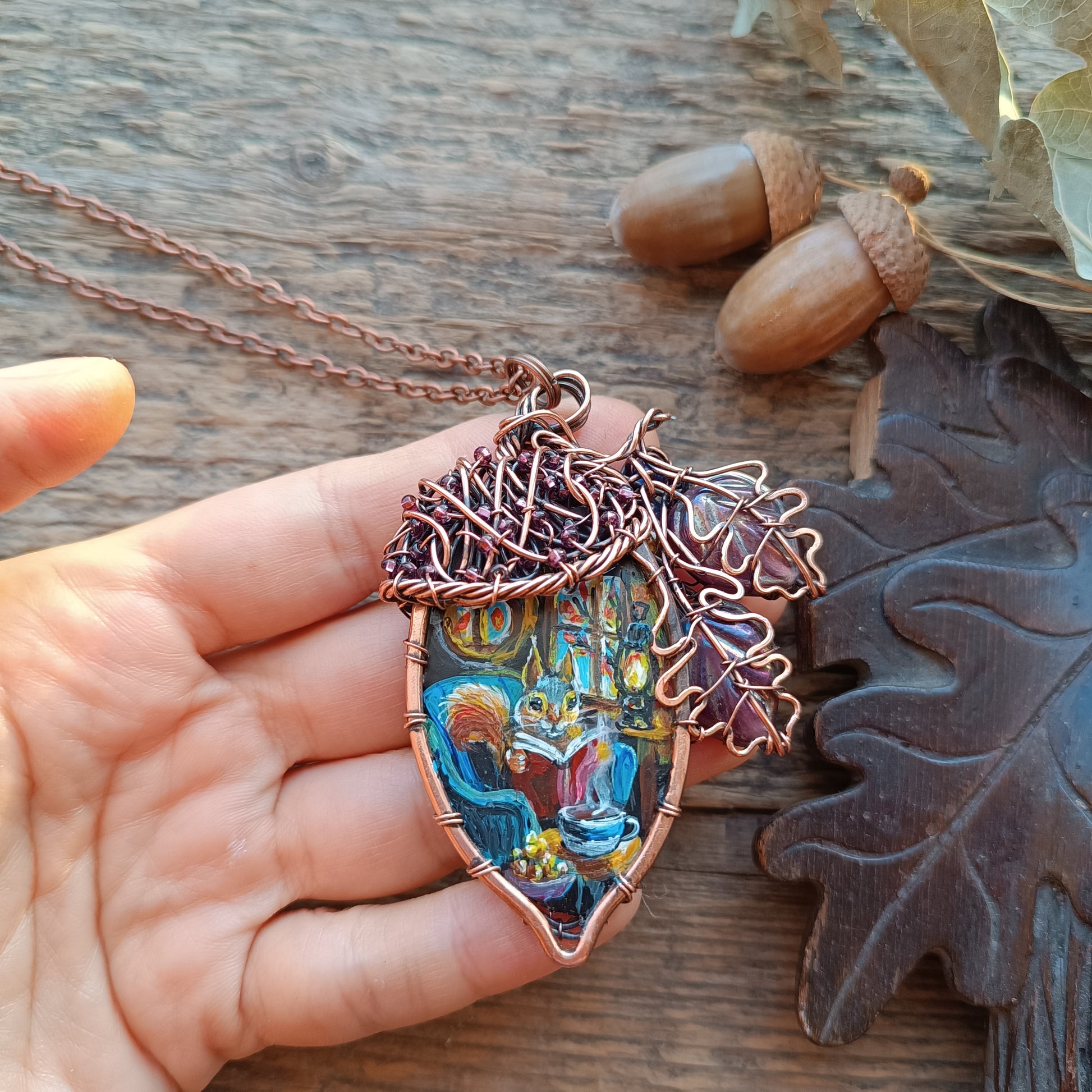 Made of copper and glass, this acorn necklace keeps a secret inside! There is a little house hidden inside, where mr Squirrel lives! Look, he's got everything he needs there😍 I can only imagine how cosy he feels sitting in his armchair by the tiny fire place reading a tiny book and drinking hot chocolate with nut syrup from his tiny cup!