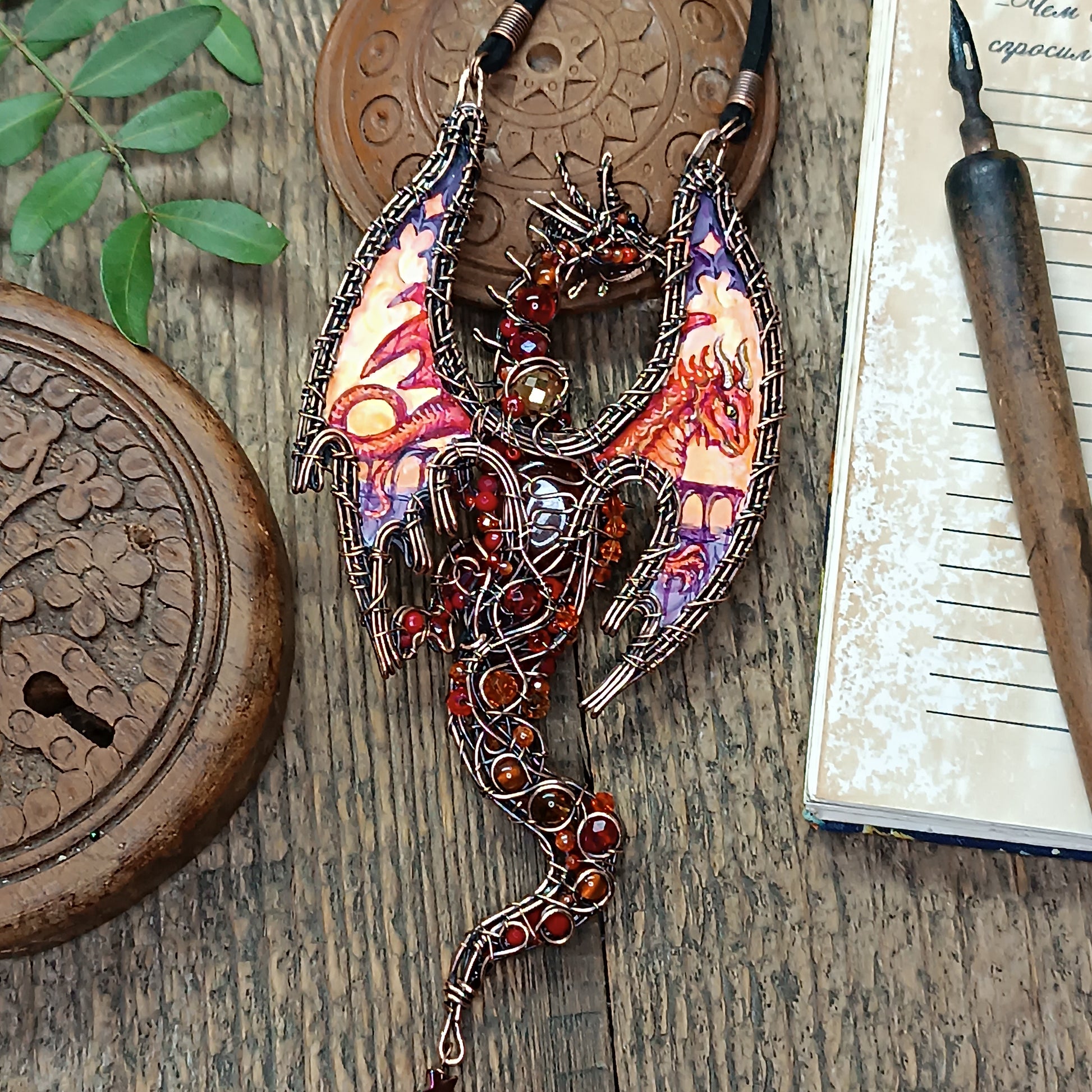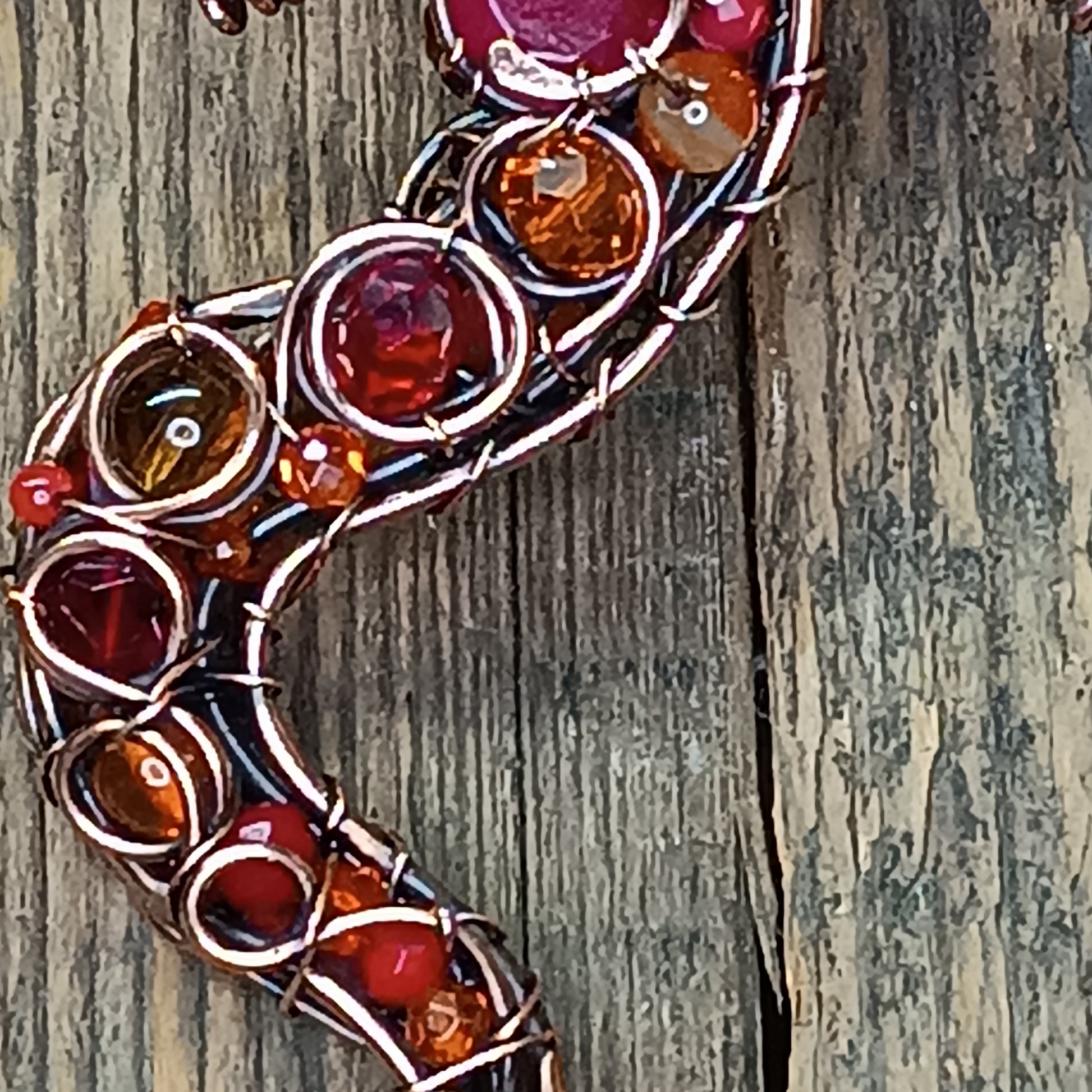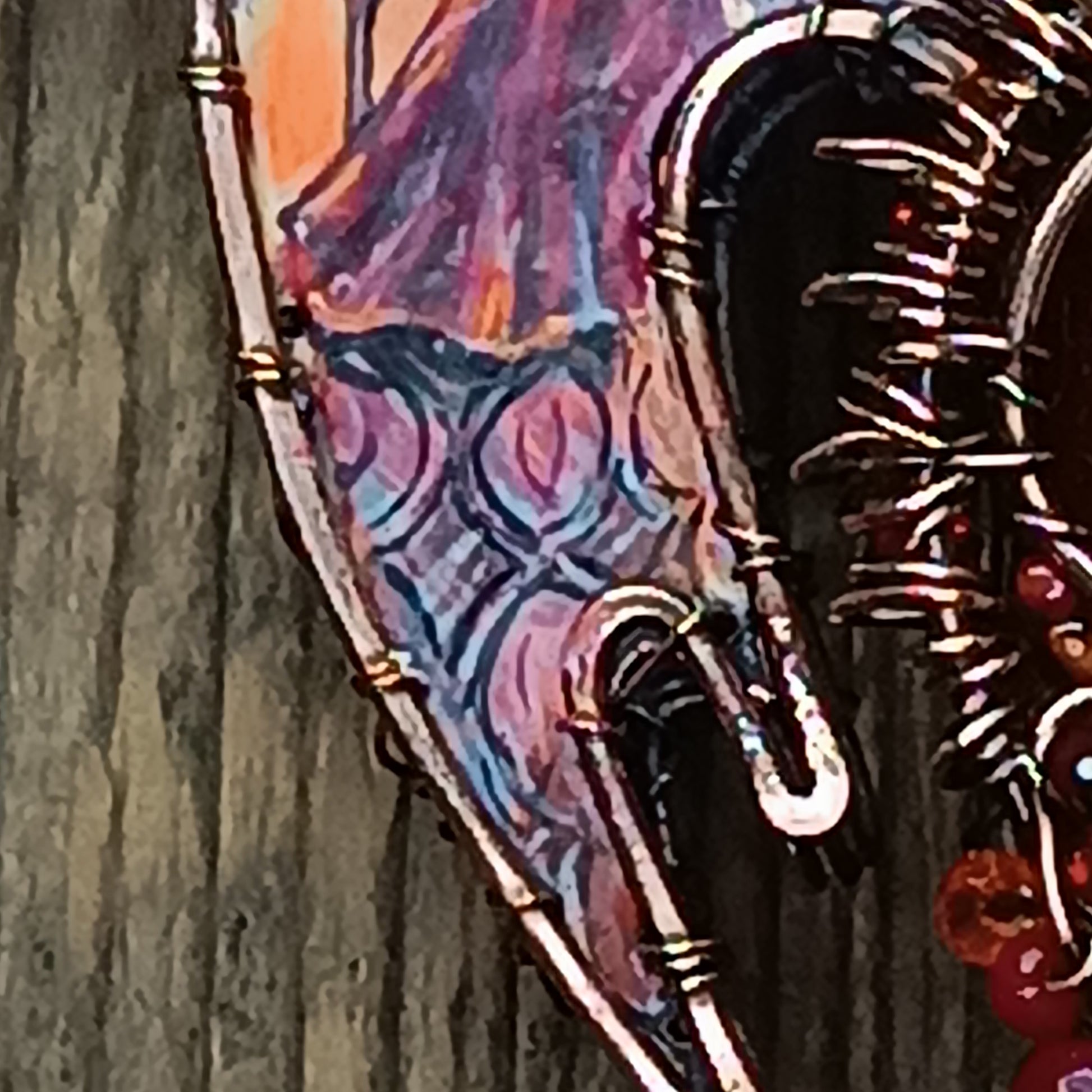 Media used: copper wire and sheet, carnelians, corals, zircons, jadeite, orange garnets, hematite, glass beads, seed beads.