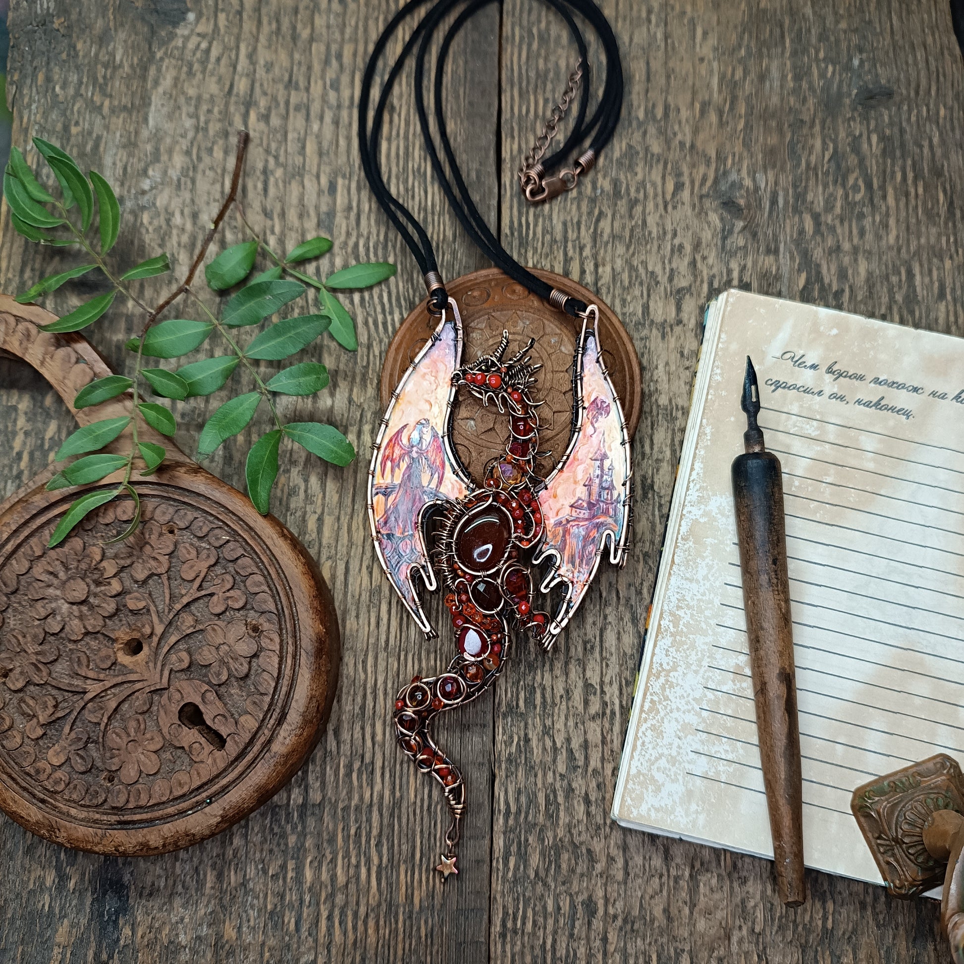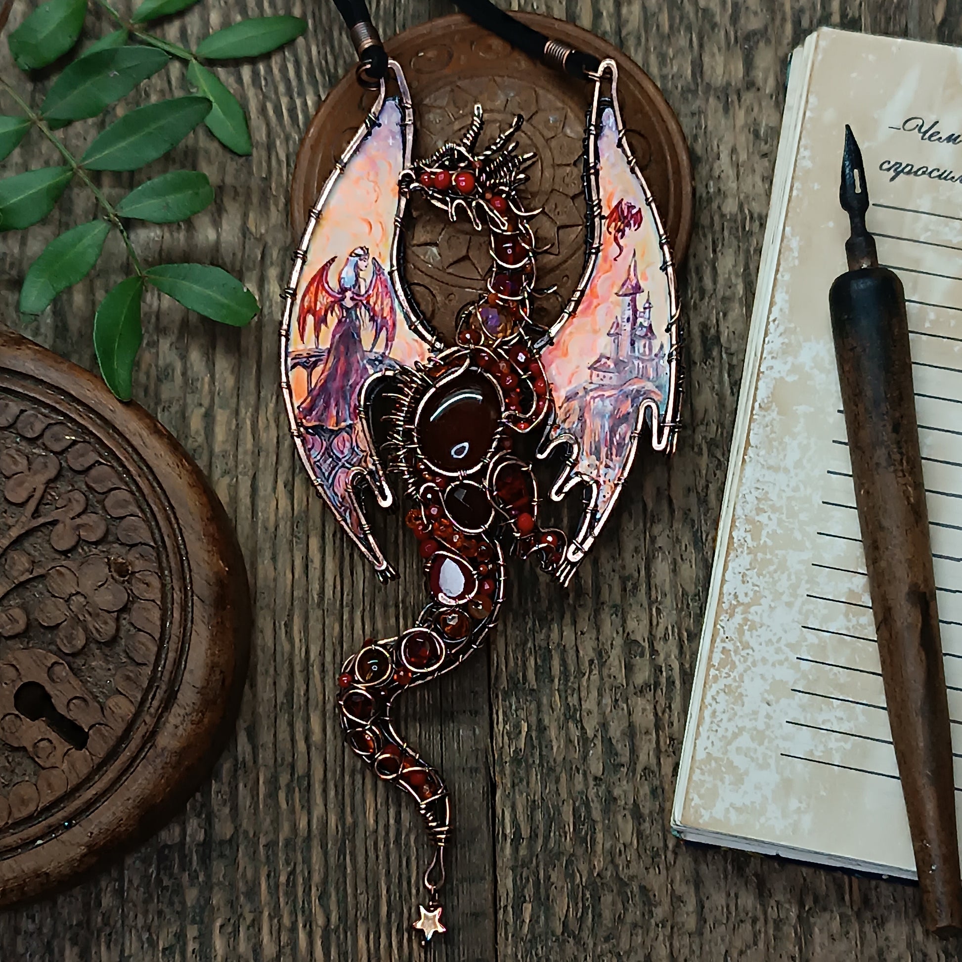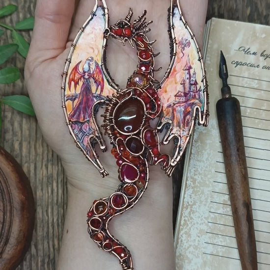 Media used: copper wire and sheet, carnelians, corals, zircons, jadeite, orange garnets, hematite, glass beads, seed beads.