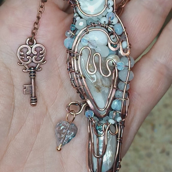 This raven necklace is made of copper, agate, mother of pearls, opalites, pearls, aquamarines, hematite, seed beadd, glass beads.