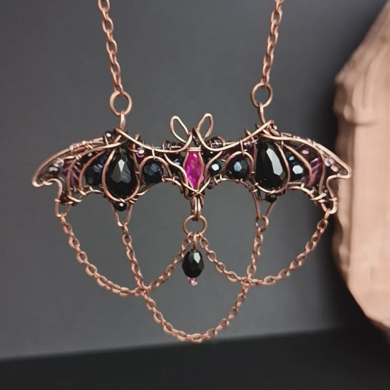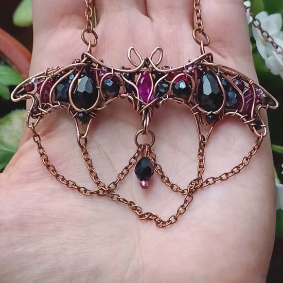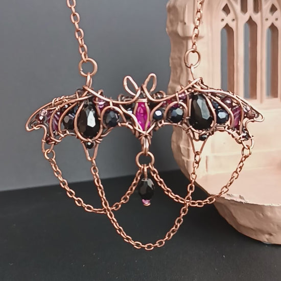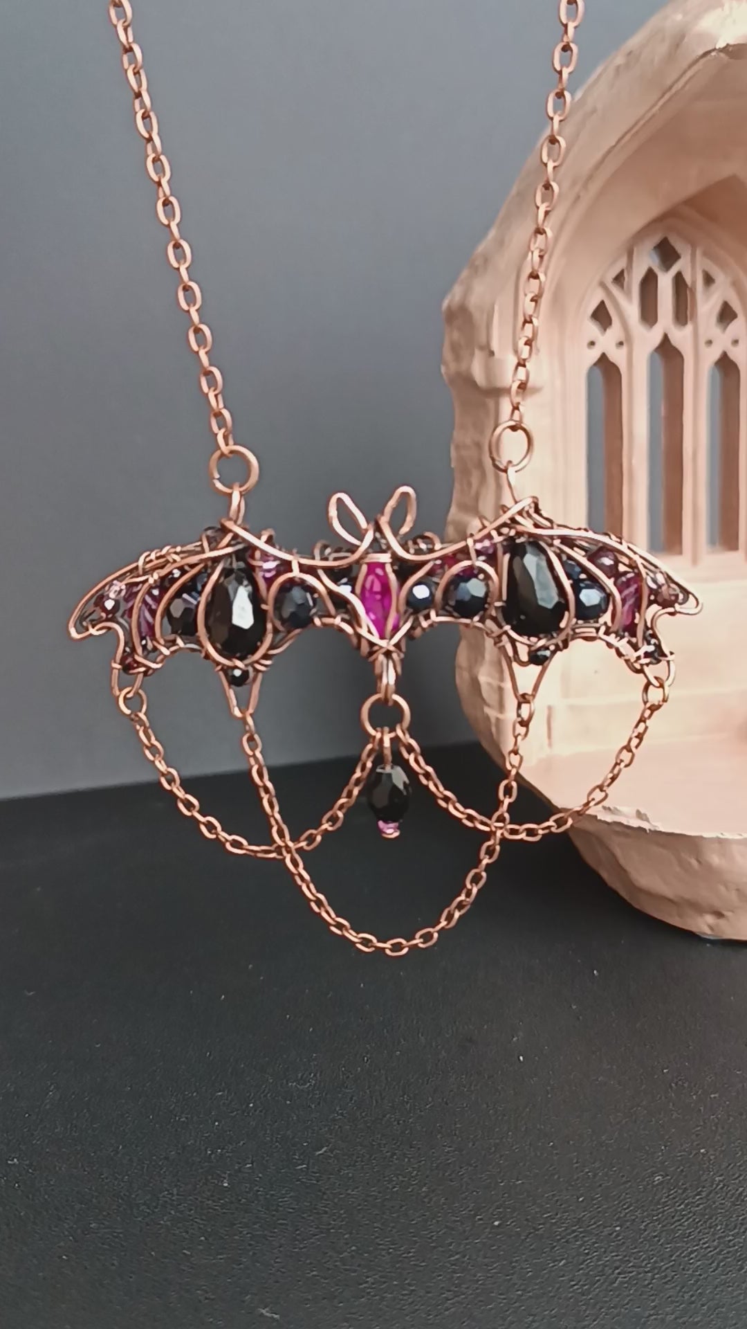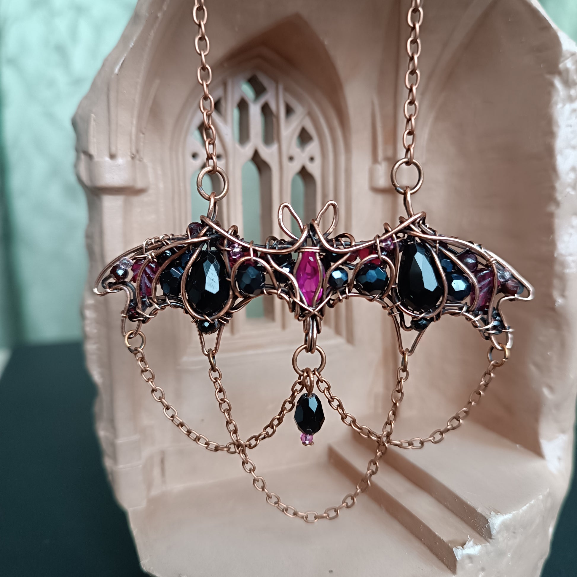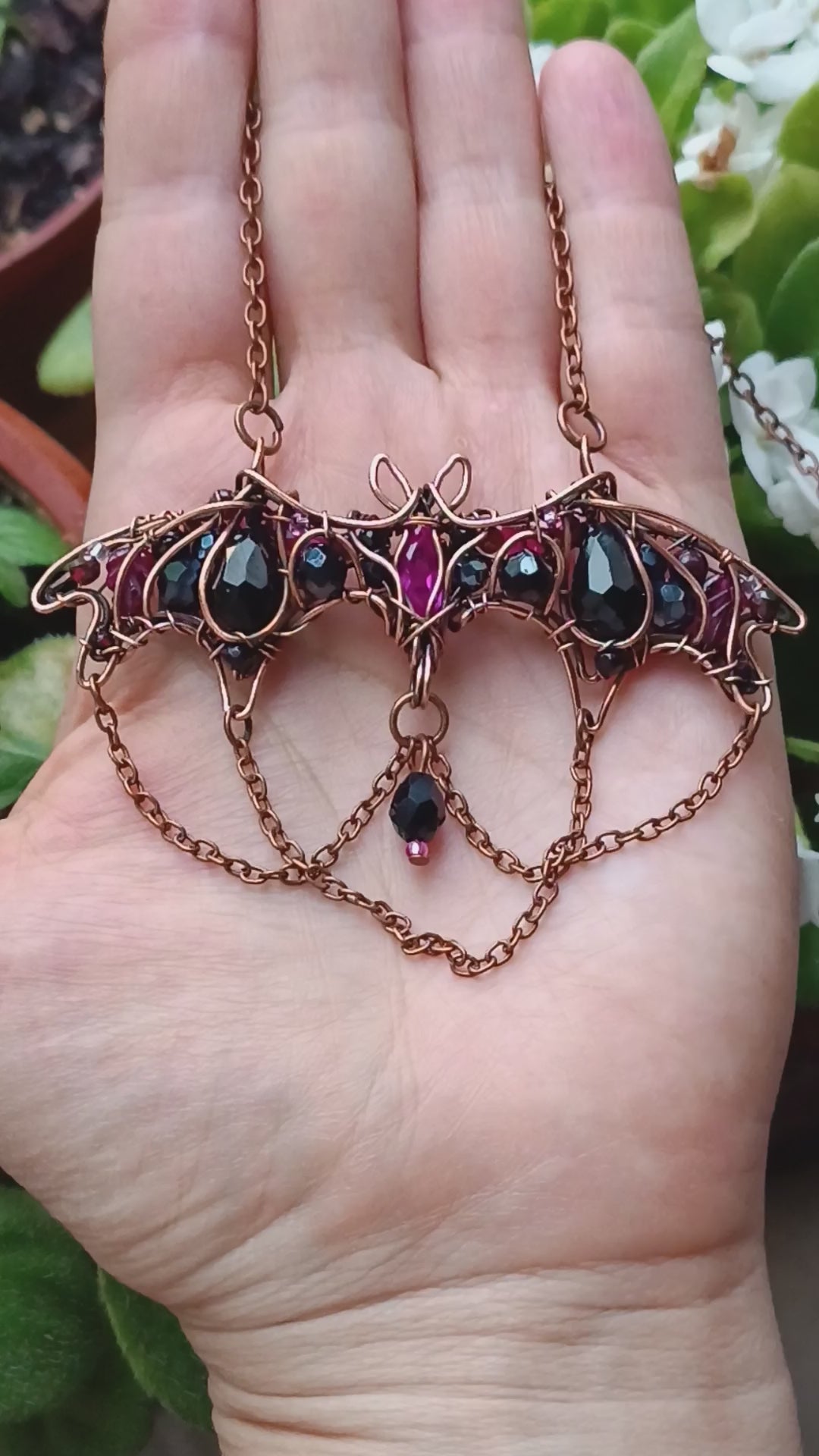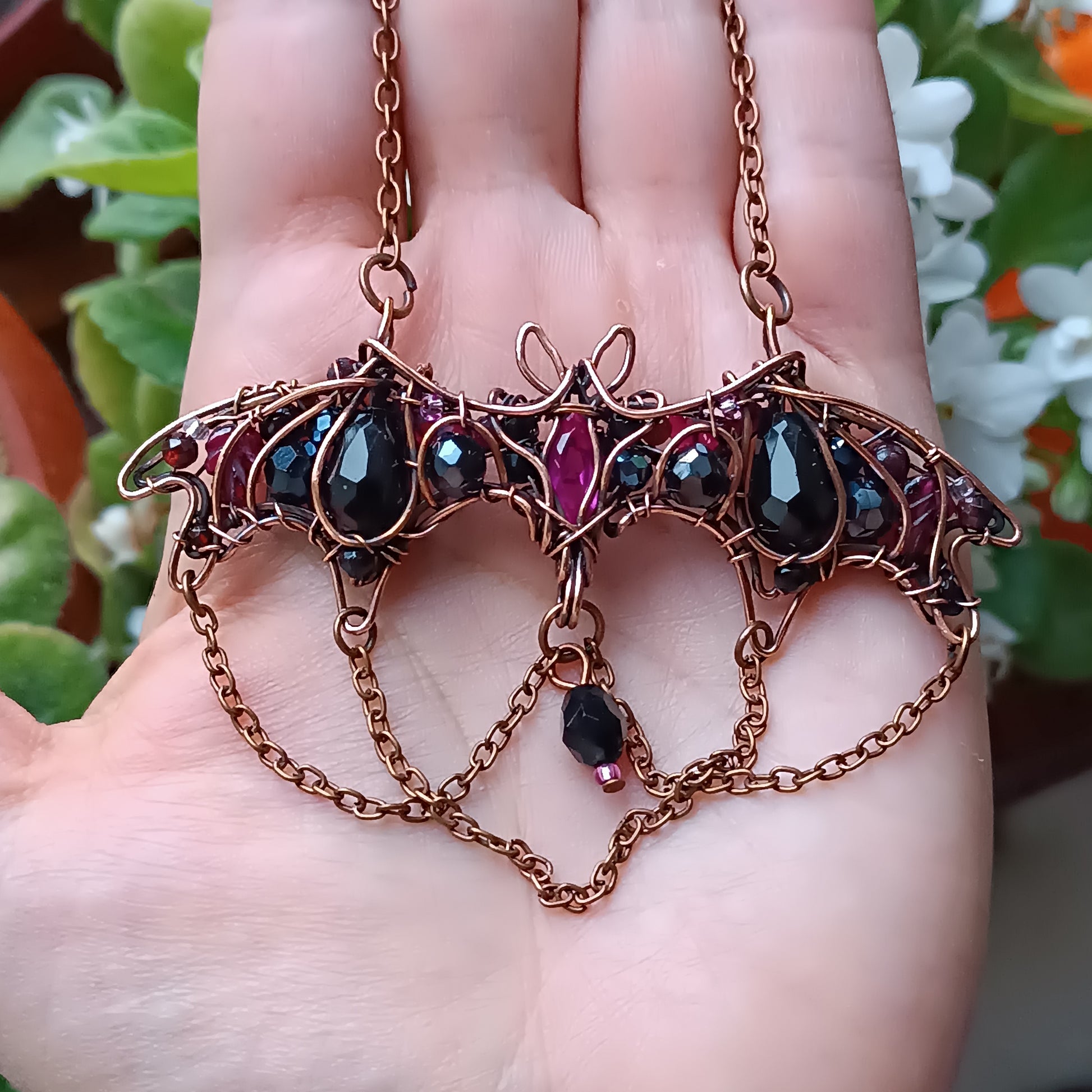 Wire wrapped bat necklace with cubic zirconia and glass beads.