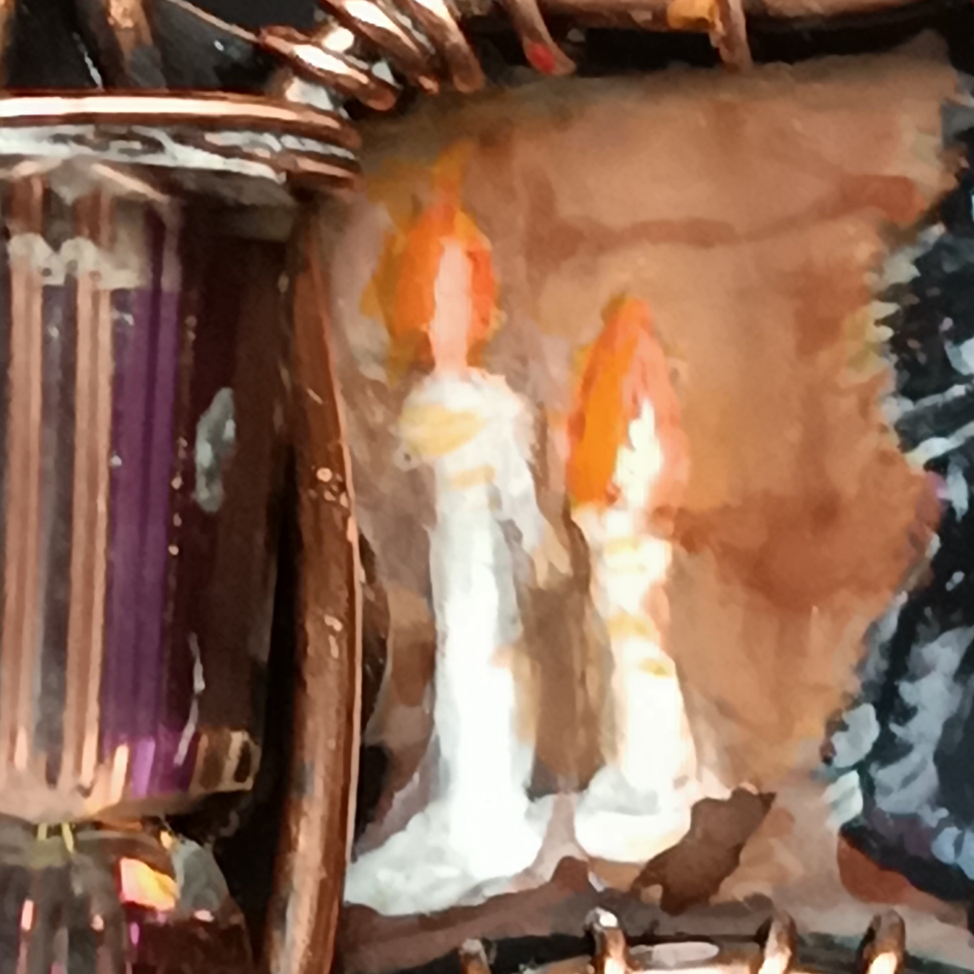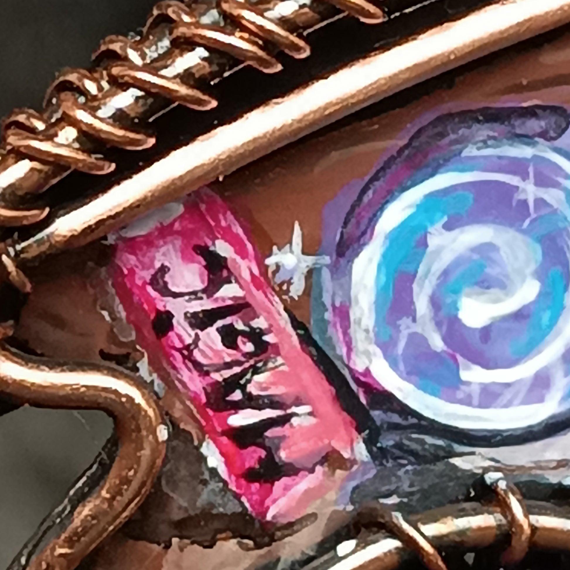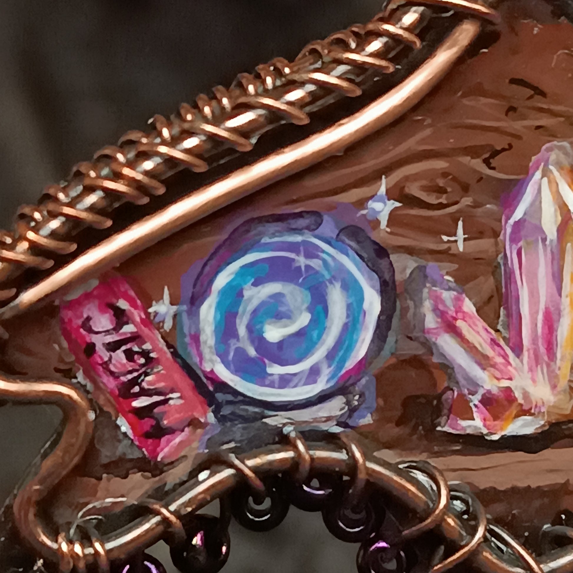 She applied the strong base on copper and painted her miniture stories in the bat's wings.